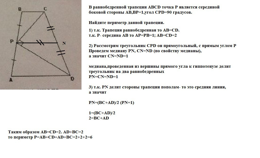 Срочно !Помогите!Даю 40 баллов!!!В равнобедренной трапеции ABCD точка Р является серединой боковой стороны АВ,ВР=1,угол СPD=90 градусов.Найдите периметр данной трапеции.