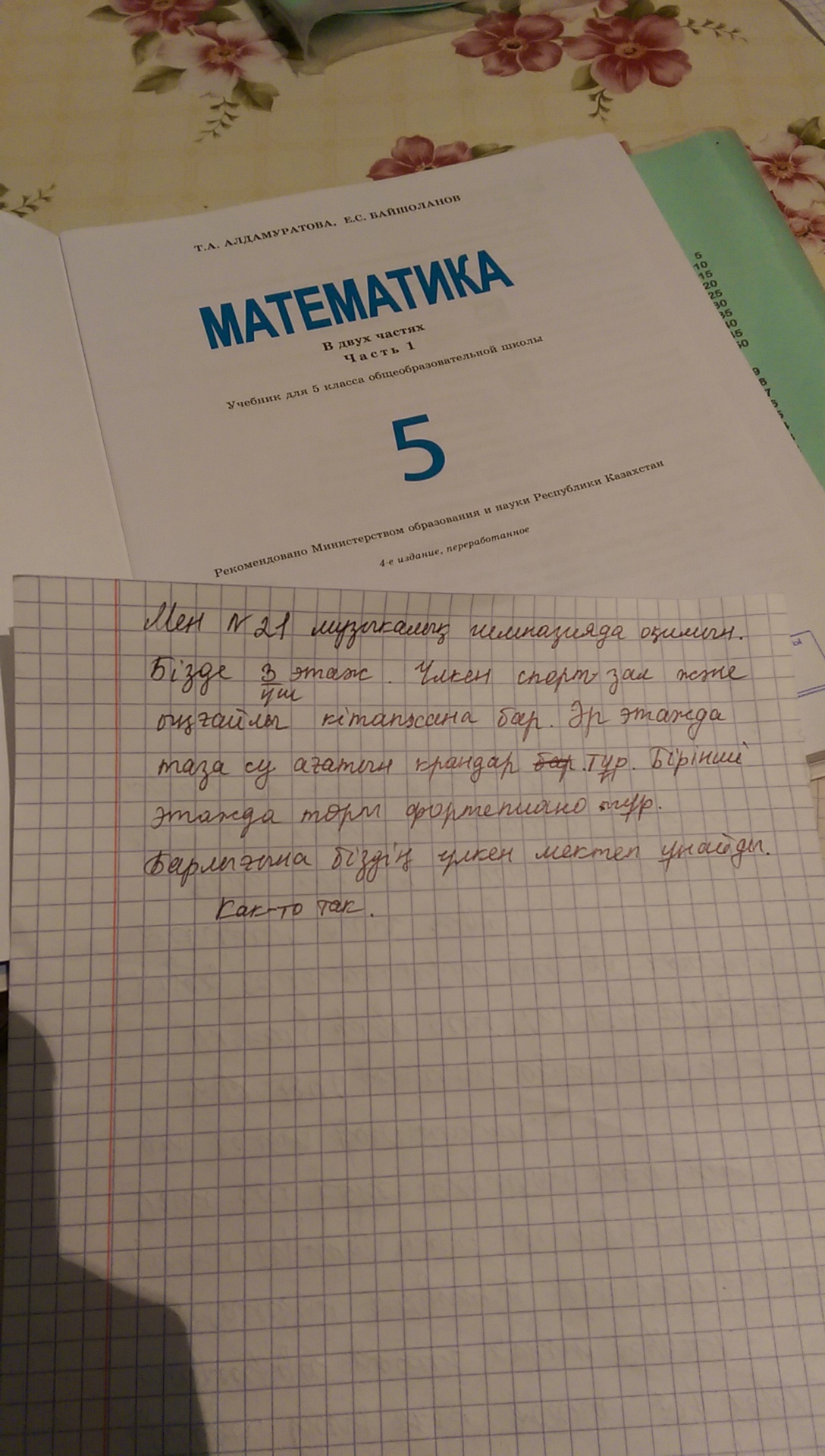 переведите на казахский Я учусь в музыкальной гимназии номер 21. У нас три этажа. Имеется большой спорт зал и просторная библиотека. На каждом этаже стоят краны с чистой водой. На первом этаже стоят четыре фортепиано. Всем нравится наша большая школа.