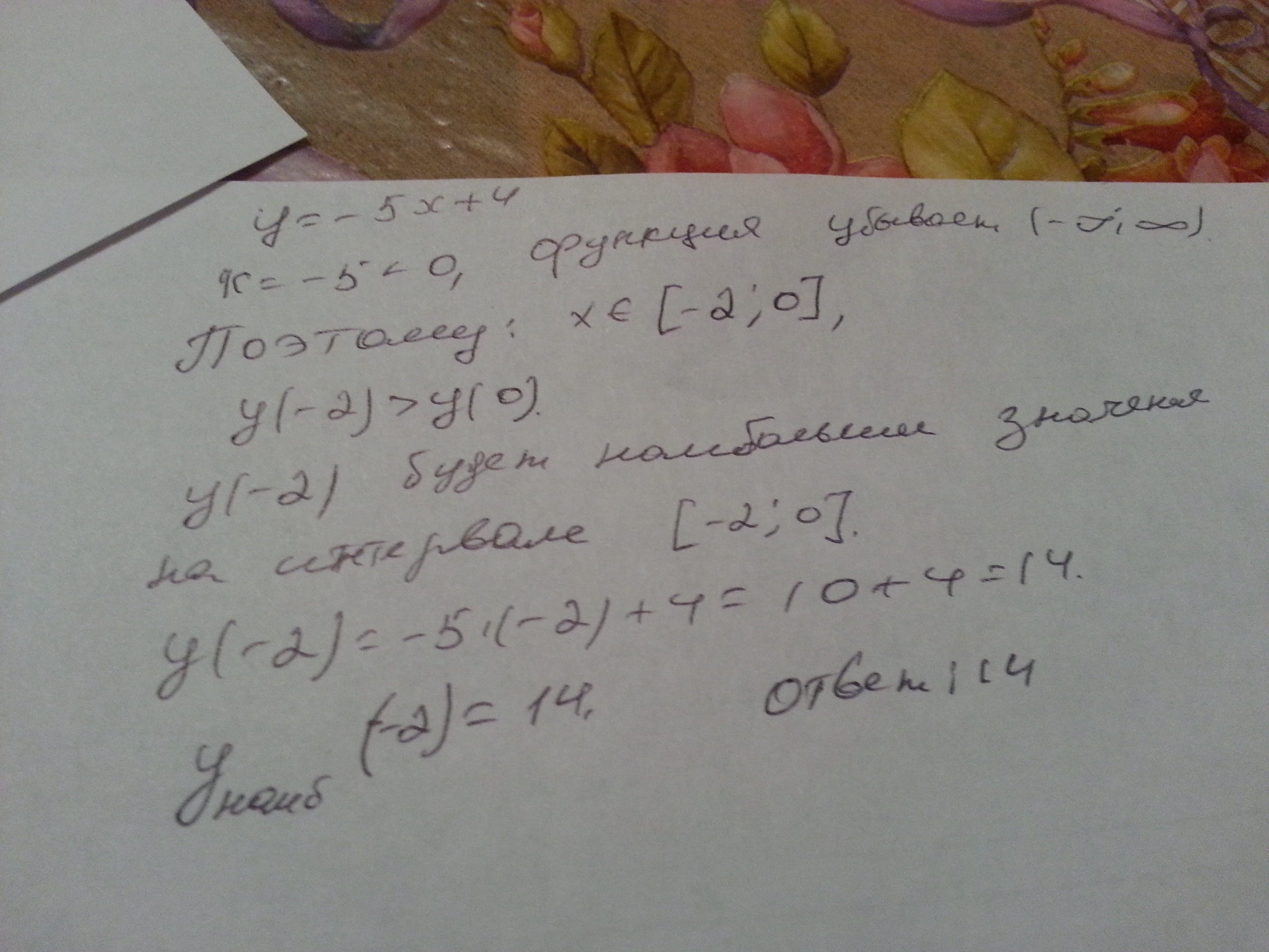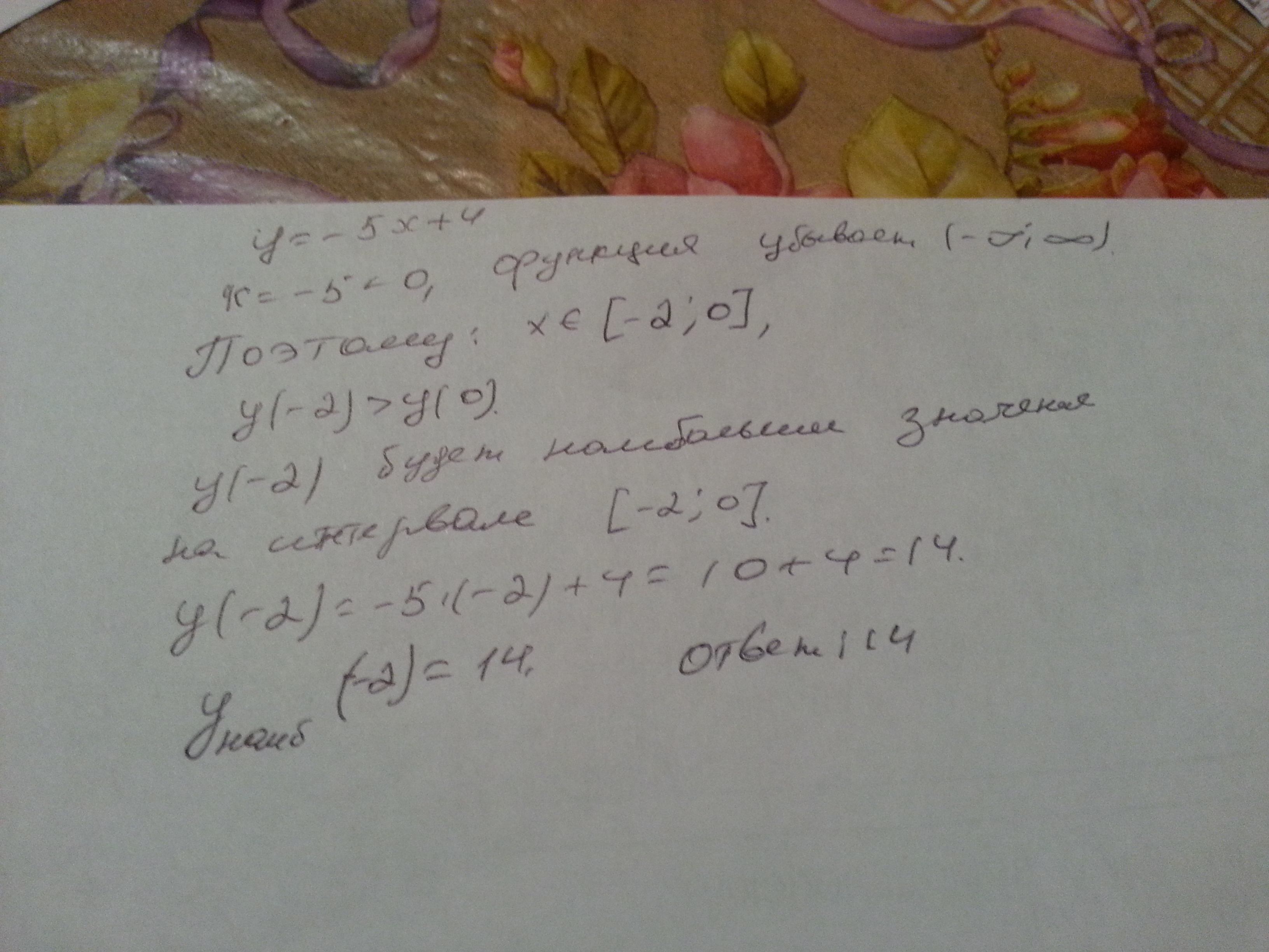 СРОЧНО!30 БАЛЛОВ! Найдите наибольшее значение линейной функции у=-5х+4 на промежутке [-2;0]