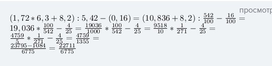 (1,72*6,3+8,2):5,42-(0,16)3=10,836+8,2:5,42-(0,16)3=19,036:5,42-(0,16)3=3,51218-0,48=3,03218