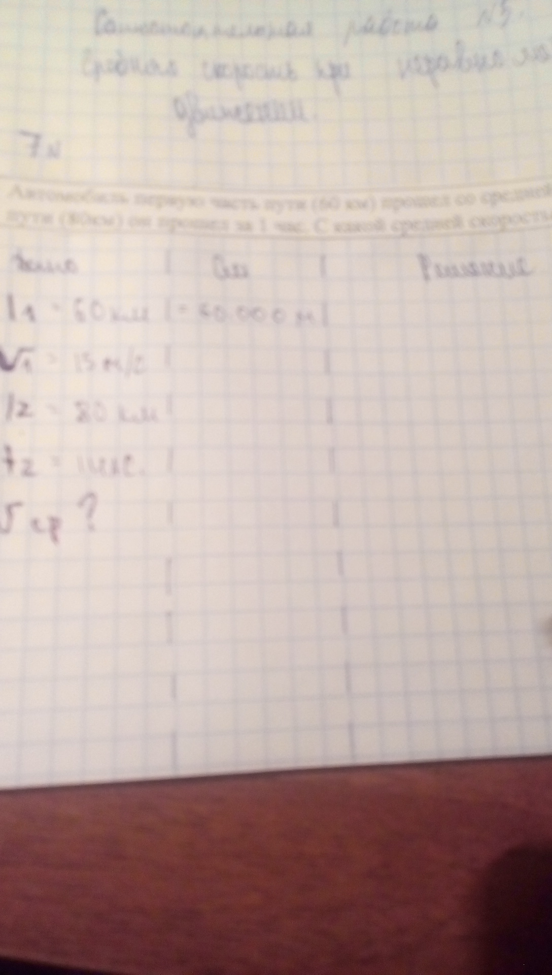 Автомобиль первую часть пути (60 км) прошел со средней скоростью 15 м/с .Остальную часть пути (80км) он прошел за час. С какой средней скоростью двигался автомобиль на всем пути ?