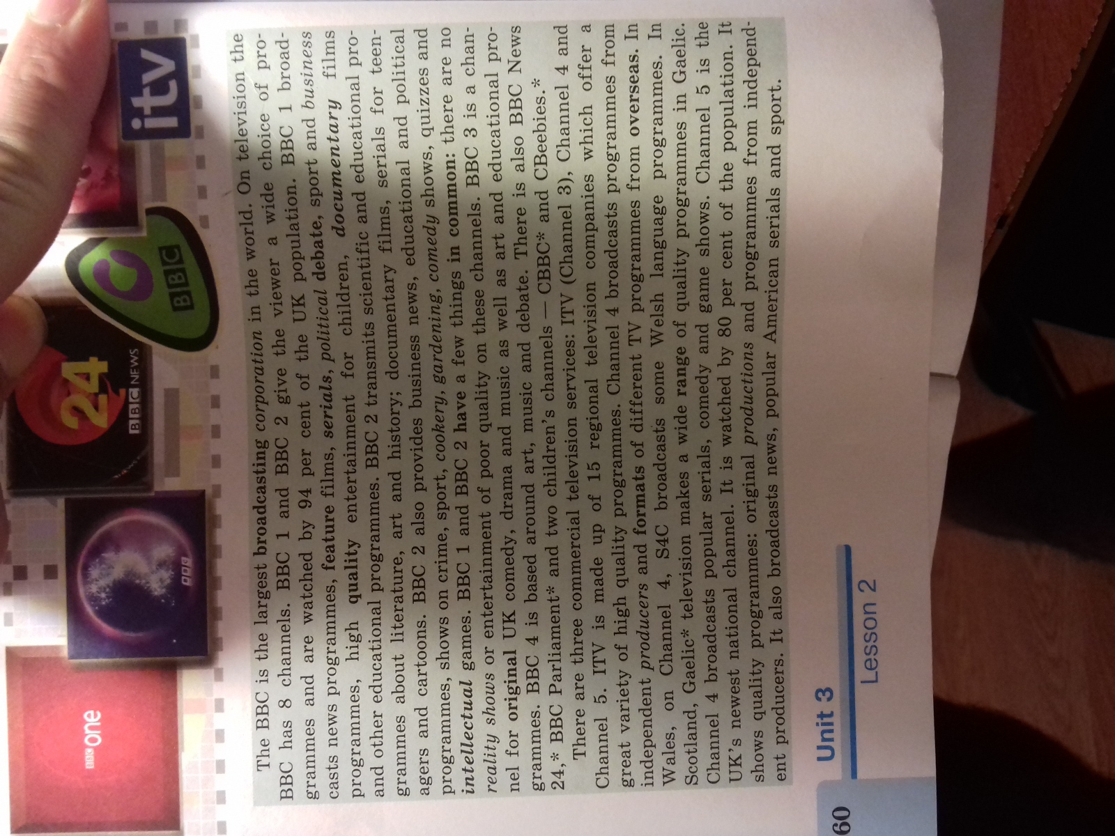 BBC является крупнейшим вещательная корпорация в мире. на телевидении BBC имеет 8 каналов. BBS 1 и BBC 2 дают зрителю широкий выбор программ и находятся под наблюдением 94 процентов населения Великобритании. BBC 1 транслирует новостные программы, художественные фильмы, сериалы, политические дебаты, спортивные и бизнес-программы, полноценно развлечения для детей, документальных фильмов и других образовательных программ. BBC 2 передает научных и образовательных программ о литературе, искусстве и истории; документальные фильмы, сериалы для подростков и мультфильмов. BBC 2 также предоставляет бизнес-новости, образовательные и политические программы, показывает на криминал, спорт, кулинария, садоводство, комедийные шоу, и интеллектуальных игр. нет реалити-шоу или субфебрильная развлечения на BBC 2. BBC 3 канала для оригинальной комедии Великобритании, драмы и музыки, а также искусства и образовательных программ. BBC 4 базируется на искусстве, музыке и дискуссий. есть также новости Би-би-24, BBC парламент и двое детей каналы, CBBC и CBeebies.