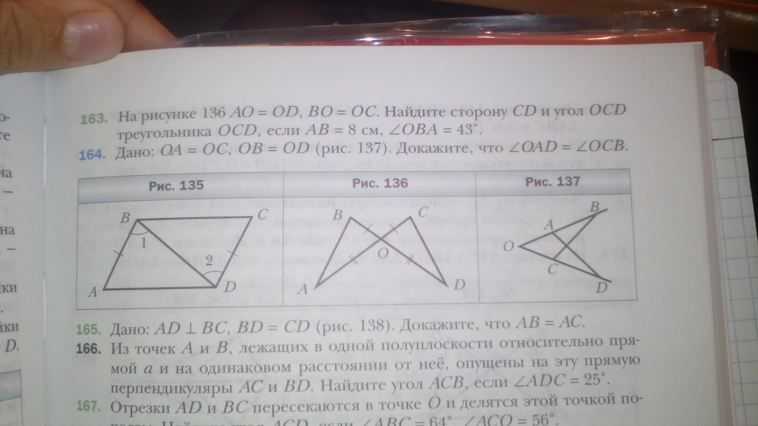 Тогда по 1му признаку равенства треугольников, эти треугольники равны, и значит равны все их элементы, то есть угол ОАД=углу ОСВ