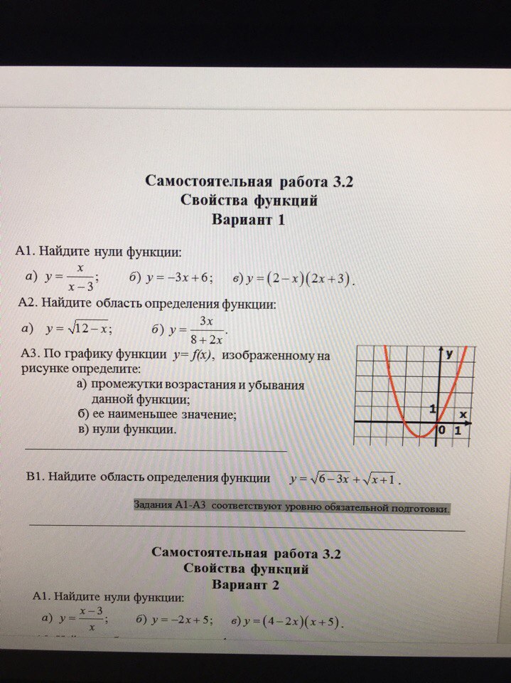 A1) a)x=0; y=0;. y=0; x/x-3=0; x=0; Ответ:(0;0) b)x=0; y=6;. y=0; -3x+6=0; 3x=6; x=2; Ответ: (0;6), (2;0); c)x=0; y=2*3=6;. y=0; x1=2; x2=-1,5; Ответ: (0;6), (2;0), (-1,5;0); A2) a)12-x>=0; 12>=x; Ответ: (-беск;12]; b)8+2x=0; 2x=-8; x=-4; Ответ:(-беск;-4), (-4;+беск); A3)a) возрастает на [-1;+беск), убывает на (-беск;-1]; b)-1; c)y=0; x=0; y=0; x=-2; (0;0),(-2;0); B1)6-3x>=0 и x+1>=0; x>=2; x>-1; Ответ: [-1;2]