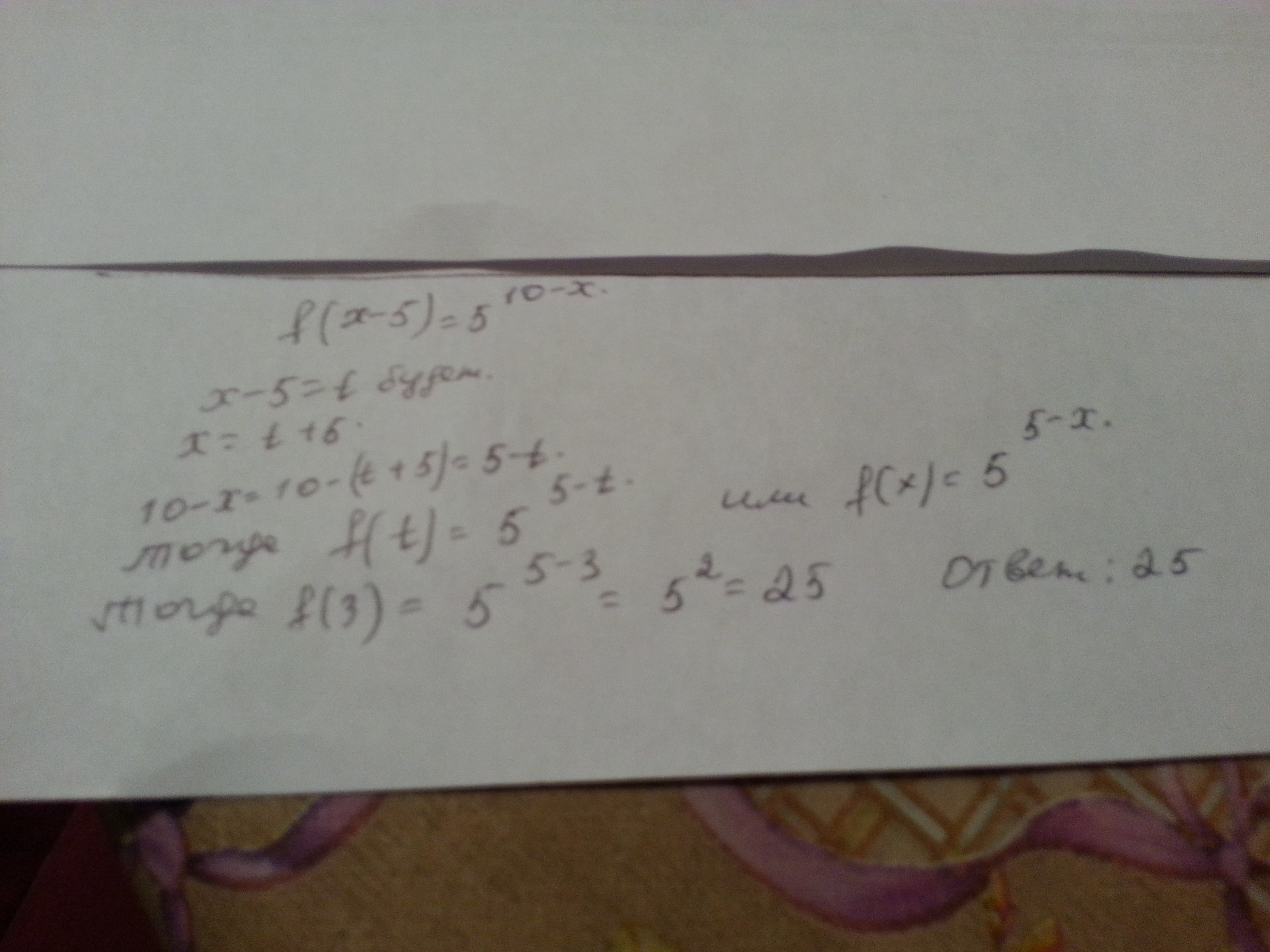 Найти f(3) если f(x-5)=5 в степени 10-х