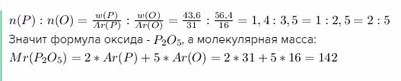 1. Относительная молекулярная масса оксида фосфора приблизительно равна 280. Согласно данным количественного анализа, это соединение содержит 56,4% кислорода. Определите точное значение молекулярной массы оксида и запишите его химическую формулу.