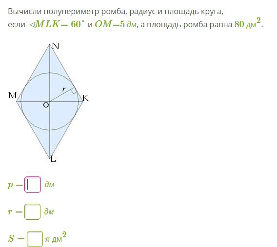 Диаг.LN делит угол L пополам. т.е. угол OLM=OLK Т.Е 60/2=30 град. Угол ОКL=180-(30+90)=60 град. Катет лежащий против угла 30 град.в прям-ом треуг-ке =половине гипот-зы т.е гипот.МL=10 дм.Все стороны ромба равны а значит полупериметр=10+10=20 дм. А полный периметр ромба =10*4=40 дм. По ф-ле радиус r=S/P т.е. r=80/40=2 дм. Площадь круга по ф-ле S=ПR^=3,14*2^=3,14*4=12,6 дм в квадрате