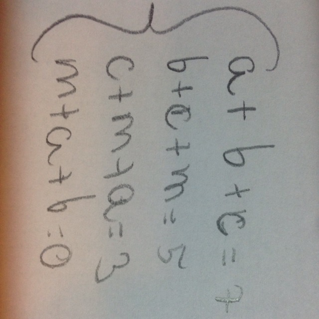 Прибавляя любые три из них и вычитая четвертое, умноженное на 2, делишь полученное на три и получаешь соответственно выбранному четвертому соответственно m, a, b, c. Тогда ответ 0;2;5;-2