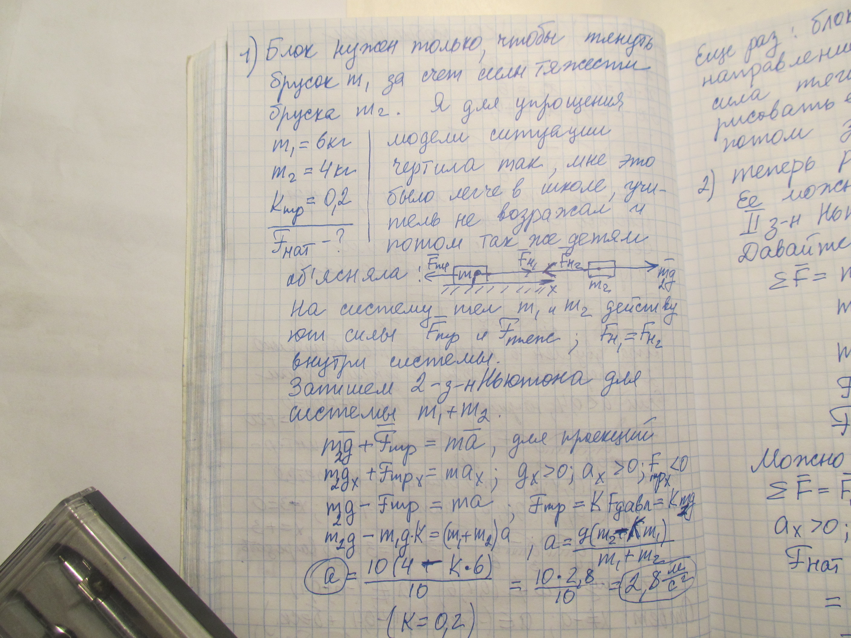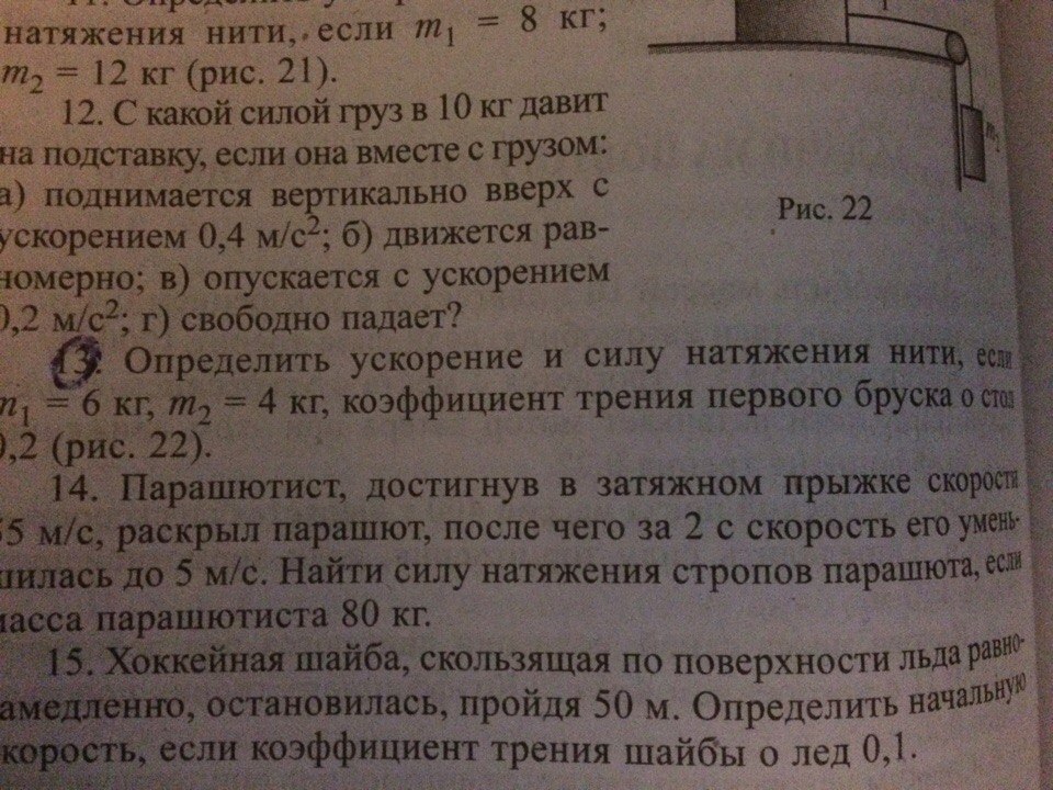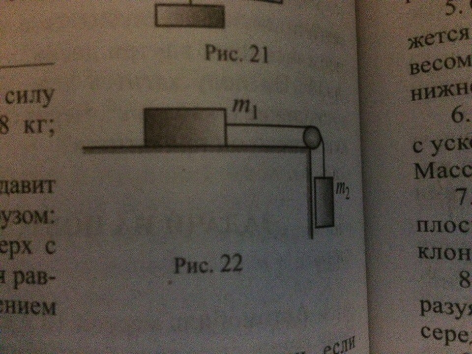 Определить ускорение и силу натяжения нити,если m1=6 кг,m2=4кг,коэффицент трения первого бруска о стол 0,2.(рис.22)