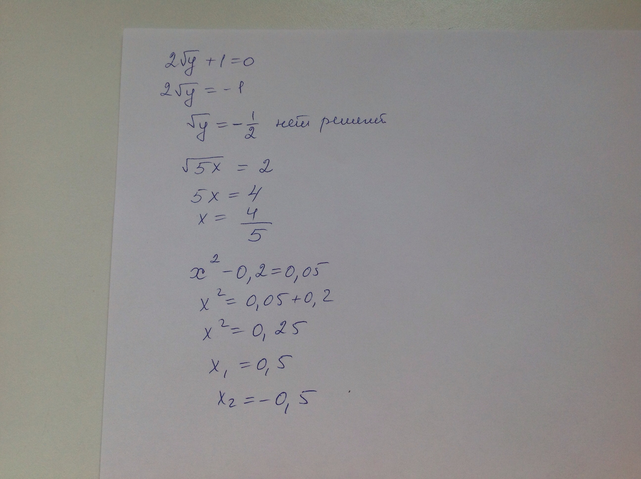 2 sqrt{y}  + 1 = 0<br />sqrt{5x} = 2<br />x^{2} - 0.2 = 0.05