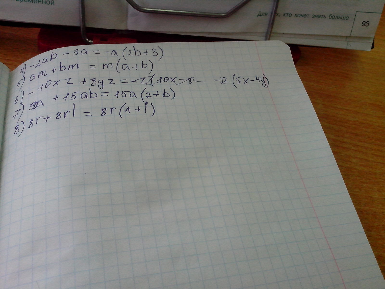 Разложите на множители и сделайте проверку: 1) ax+ay 2) mx+nx 3) -xy+2x 4) -2ab-3a 5) am+bm 6) -10xz+8yz 7) 30a`+15ab 8)8r`+8rl