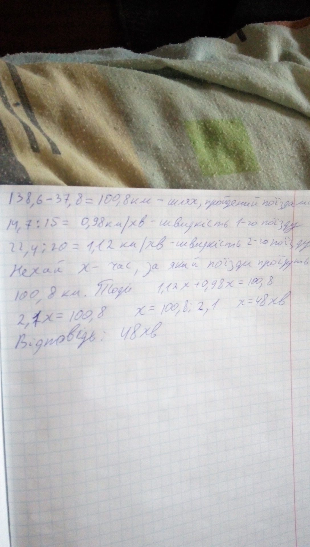 Із двох станцій назустріч один одному одночасно вирушили два поїзди. Один поїзд проходить 14,7 км за кожні 15 хв, а другий - 22,4 км за 20 хв. Через скільки годин після початку руху відстань між поїздами становитиме 37,8 км, якщовідстань між станціями дорівнює 138,6 км? ДОПОМОЖІТЬ БУДЬ ЛАСКА!
