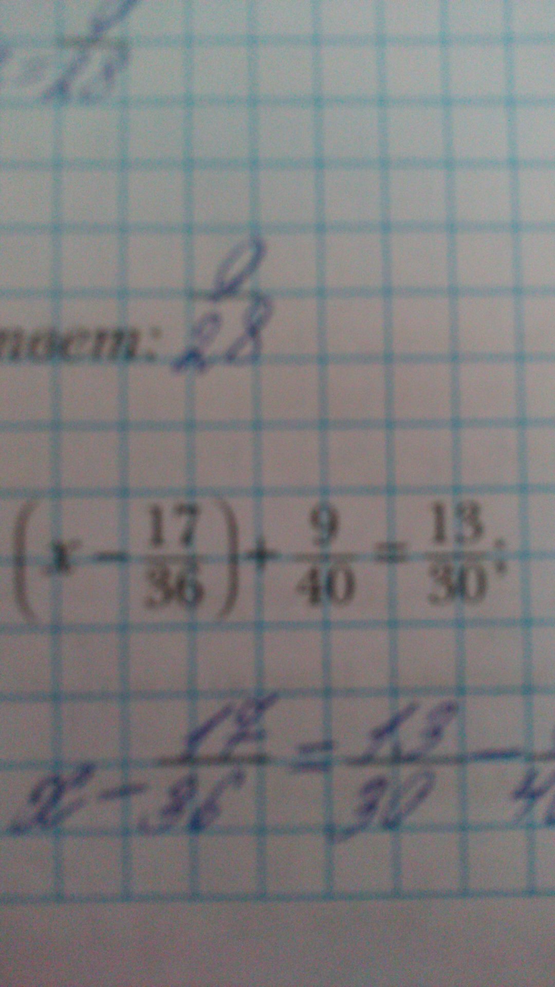 (x- frac{17}{36} )+ frac{9}{40} = frac{13}{30}  \  \  \ x- frac{17}{36}=frac{13}{30} -frac{9}{40} \  \  \ x- frac{17}{36}=frac{52}{120} -frac{27}{120} \  \  \x- frac{17}{36}= frac{25}{120}   \  \  \ x=frac{5}{24}+frac{17}{36} \  \  \ x=frac{25*6}{216}+frac{17*9}{216} \  \  \ x= frac{150+153}{216}  \  \  \ x=1 frac{87}{216}  \  \  \ x=1 frac{29}{72}