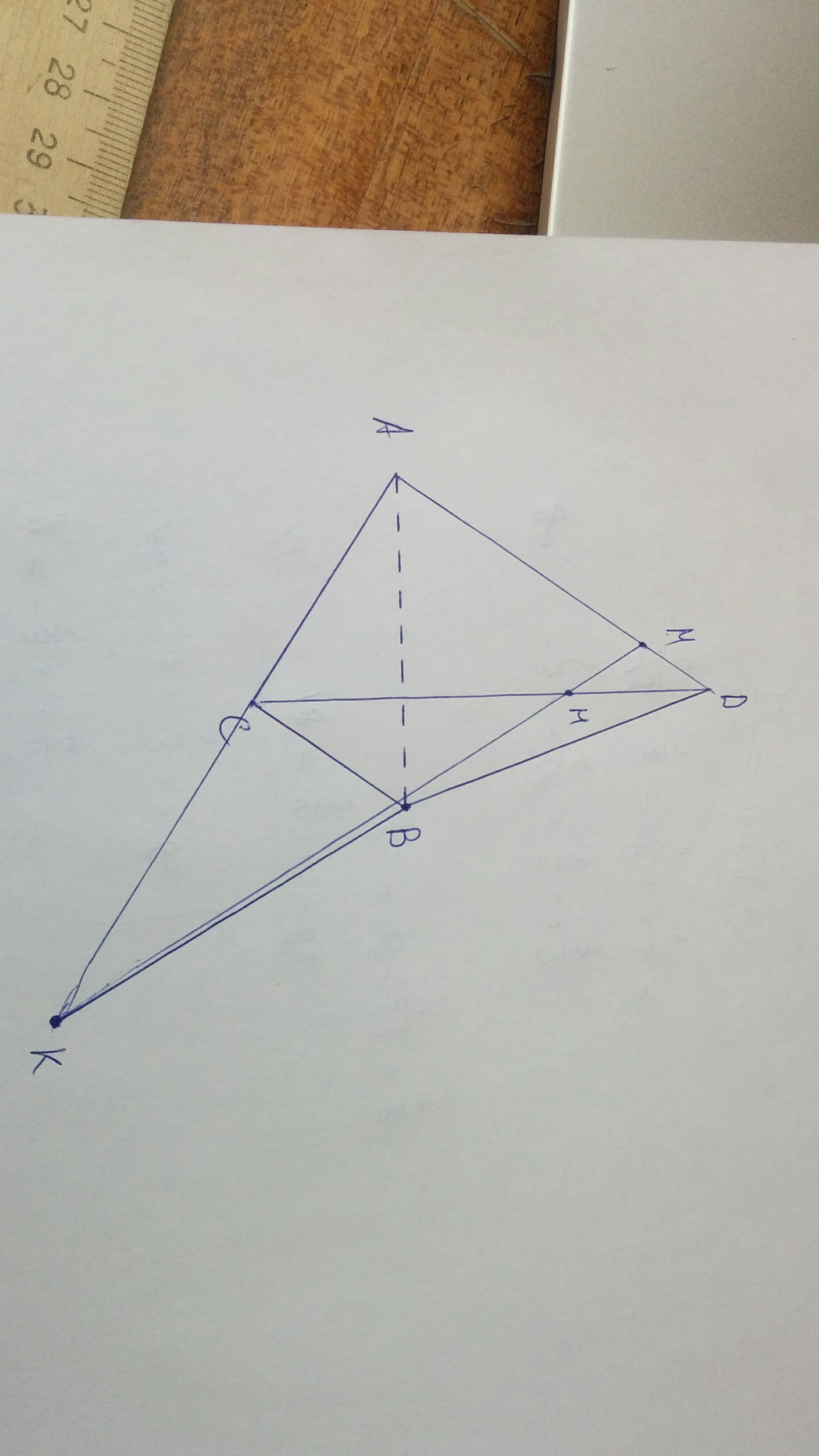точка K - точка пересечения прямой MH с плоскостью ABC. Прямая BK - линия пересечения плоскостей MHB и ABC.