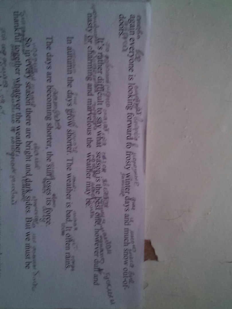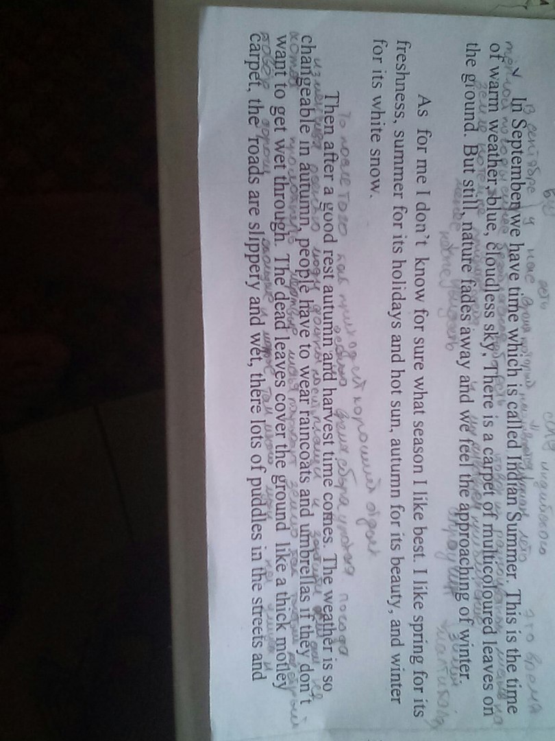 В сентябре у нас есть время, которое называется Indian Summer Это теплой погоды голубое безоблачное небо Существует ковер из разноцветных leav он землю. Но все-таки природа исчезнет, и мы чувствуем приближение Winte Что касается меня, я не знаю точно, какое время года мне нравится больше всего я люблю весну, лето reshness для своих праздников и жаркое солнце, осень за ее красоты, Wi и или его белый снег. курица после хорошего отдыха осенью и время сбора урожая идет. Мы handeable осенью люди должны носить плащи и зонтики, если т муравей, чтобы промокнуть через Мертвые листья покрывают землю как толстый mч arpet дороги скользкие и мокрые, там много луж в стресс