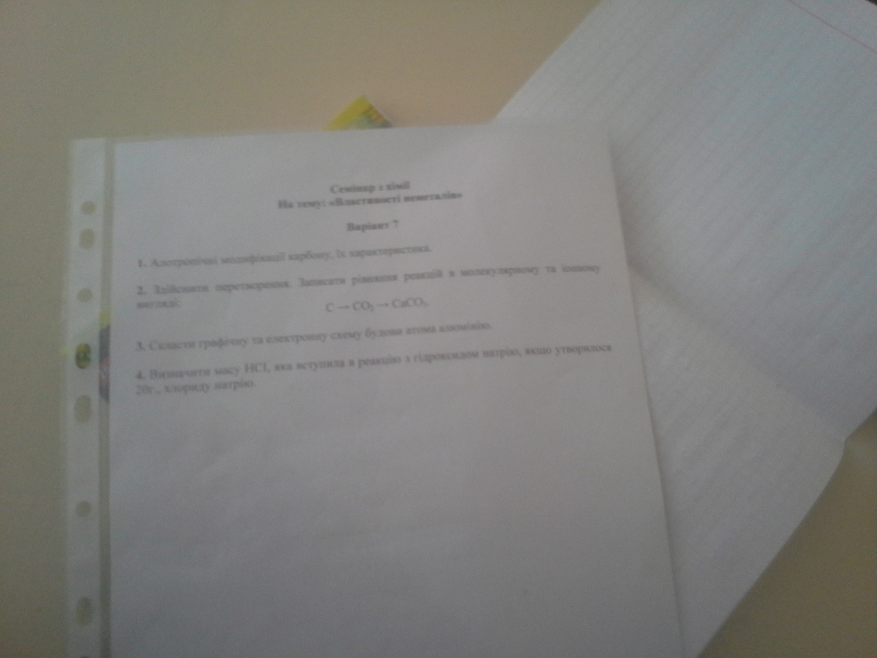 дуже погано видно, але там де алюній пишу AL зверху зліва пишете 13 потім йде електронна формула,яка має вигляд 1s2 2s2 2p6 3s2 3p1.Там де здійснити перетворення С+О2 - СО2, СО2 + Н2СО3 - САСО2+ Н2О