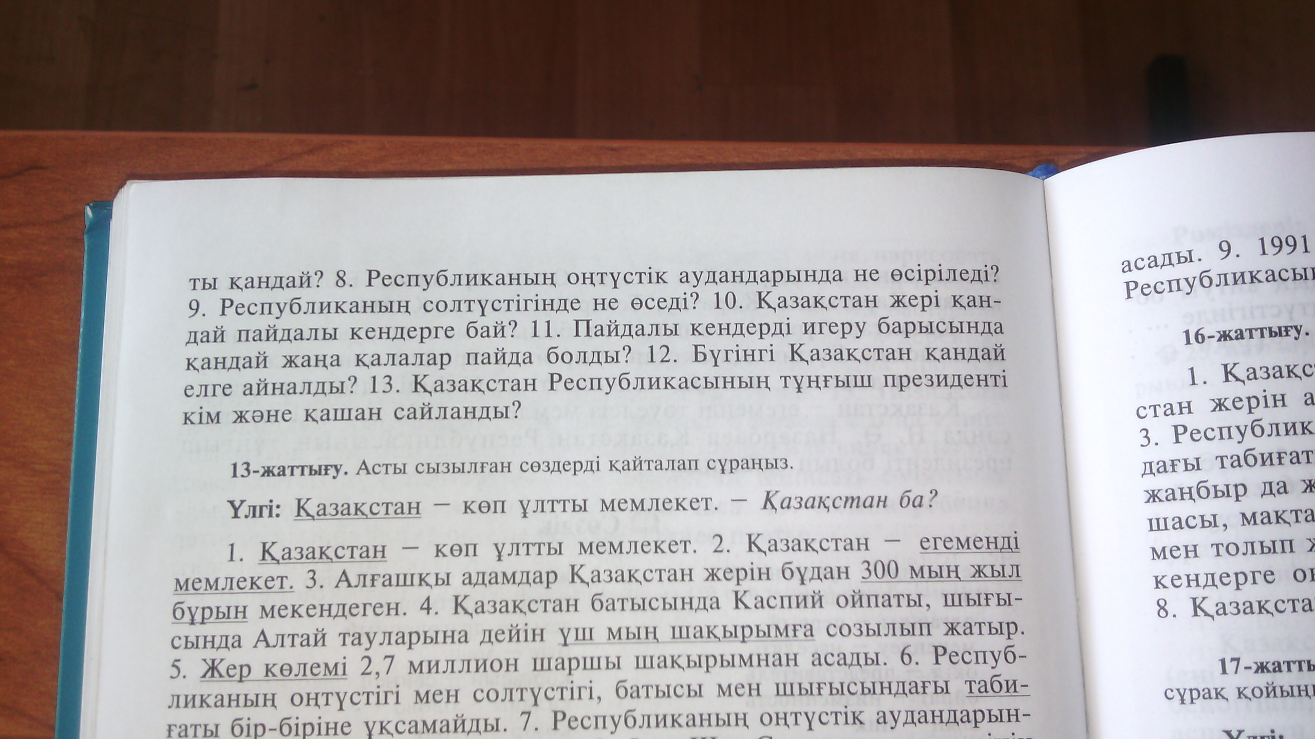 Қазақстан пайдалы қазбалар жөнінен Менделеев кестесіндегі 105элементтің 90астамы бар.ҚР республикасы пайдалы қазбалар жөнінен дүние жүзі бойынша 9орында тұр.Бүгінгі Қазақстан тәуелсіз,дамыған мемлекетке айналды.Қр президенті Нұрсұлтан Əбішұлы Назарбаев.Қазақстанның оңтүстігі мал шаруашылығы мен егін шаруашылығына өте биім.Қазақстанның солтүстігінде бидай, арпа өндіріледі.