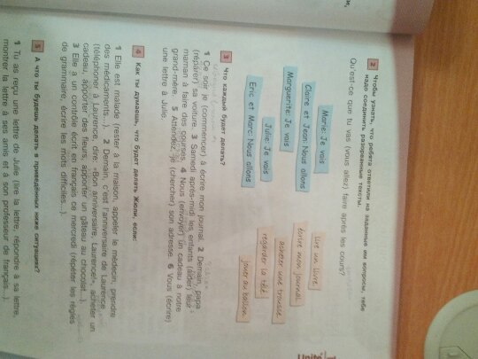 3. Je vais commencer - Вечером я начну вести свой дневник. - Va réparer - Завтра отец будет ремонтировать свой автомобиль. - les enfants vont aider - В суботу после обеда дети помогут маме делать покупки. - nous allons envoyer - Мы отправим подарок нашей бабушке. - Je vais chercher - Подожди,я поищу его адрес. - Vous allez écriver - Вы напишете письмо Жули.