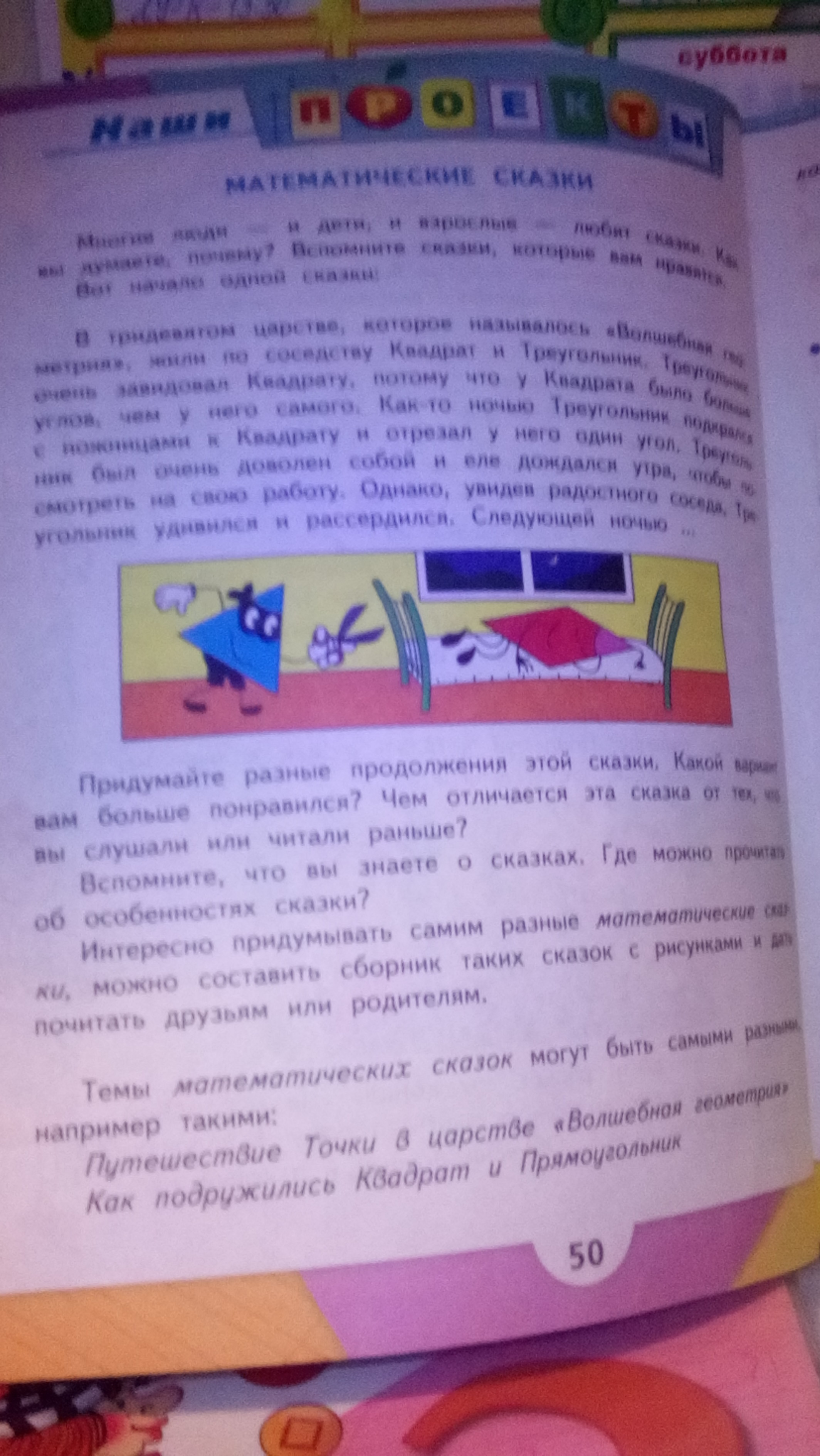 Прямоугольник говорит Квадрату: «Я почти такой же, как ты, у меня тоже четыре угла, правда, я длиннее. Дверь – прямоугольник, книга – прямоугольник».