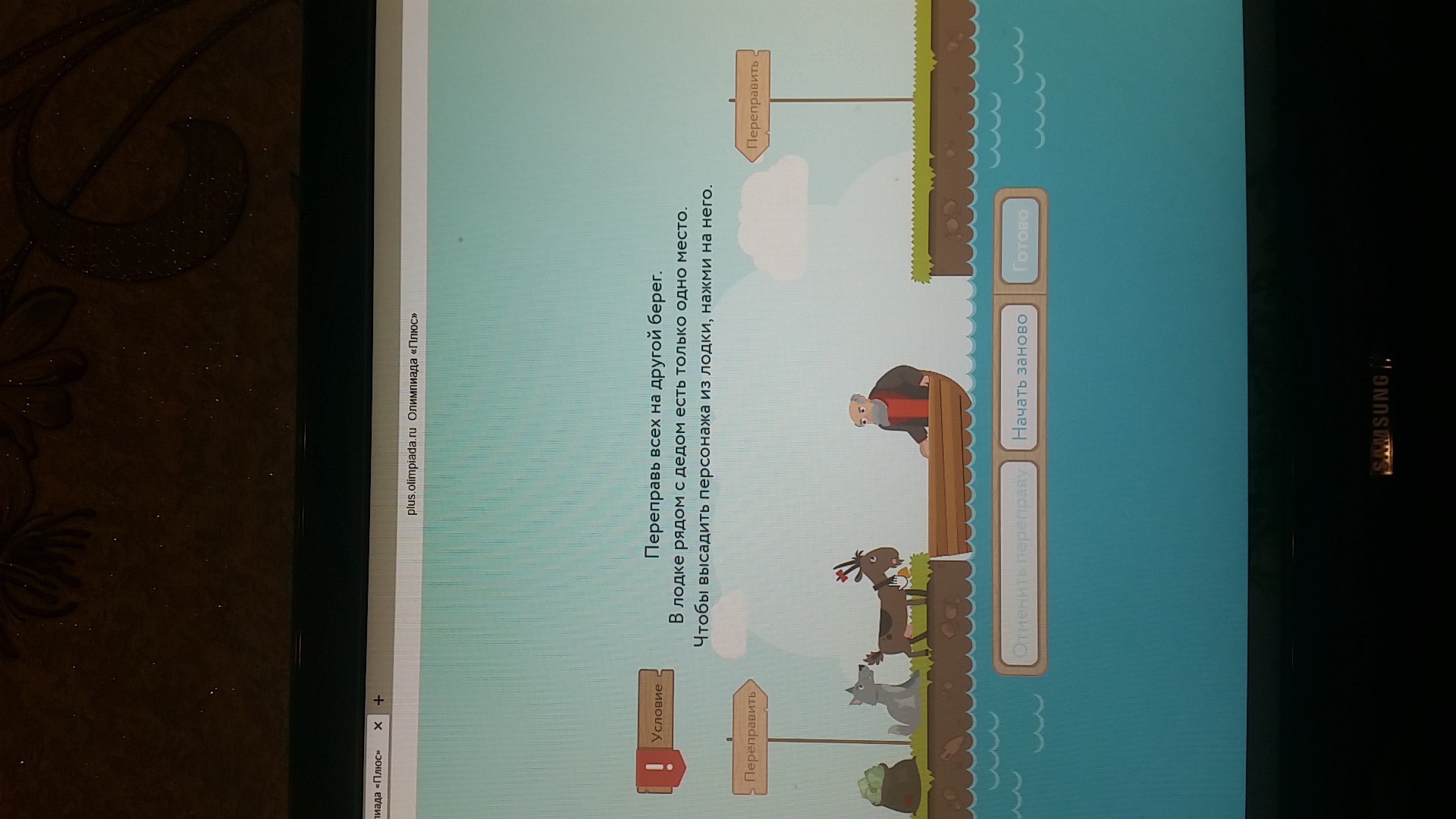 переправь всех на другой берег. В лодке рядом с дедом есть только на одно место. Чтобы высадить персонажа из лодки,нажми на него. ответ