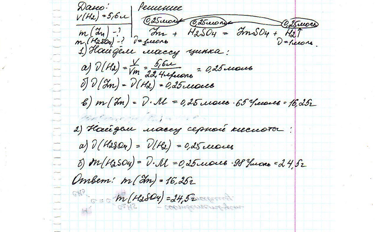 Сколько граммов цинка и серной кислоты вступили в реакцию если при этом выделилось 5,6 л водорода (н.у.)