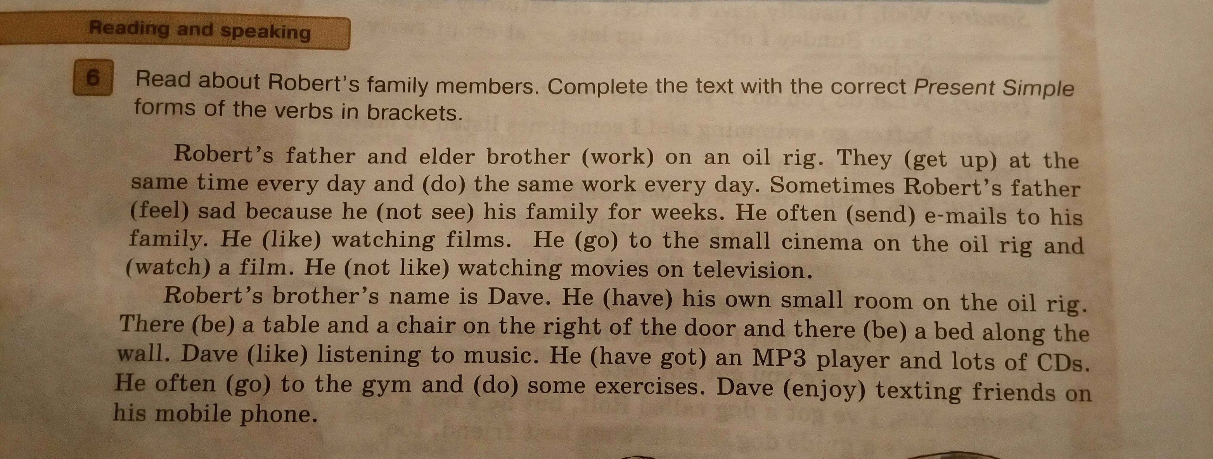 Отец и старший брат Роберта работают на нефтяной вышке. Они просыпаются в одно время и делают одну и ту же работу каждый день. Иногда отец Роберта чувствует себя грустно, потому что он неделями не видит свою семью. Он часто посылает электронные письма своей семье. Ему нравится смотреть фильмы. Он ходит в маленький кинотеатр на нефтяной вышке и смотрит фильм. Ему не нравится смотреть фильмы по телевизору.Брата Роберта зовут Дейв. У него есть своя собственная маленькая комната на нефтяной вышке. В ней есть стол и стул справа от двери и кровать вдоль стены. Дейв любит слушать музыку. У него есть MP3 плеер и много дисков. Он часто ходит в спортзал и делает упражнения. Ему нравится писать своим друзьям через мобильный телефон.