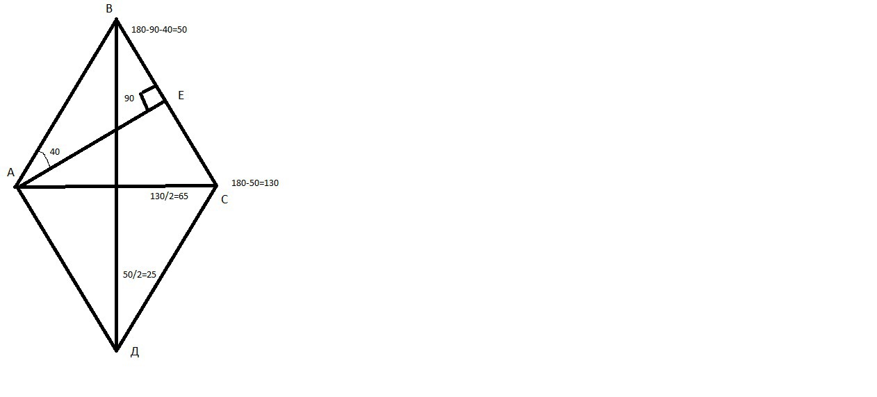 Половина угла 50/2=25градусов -угол между стороной и большей диагональю