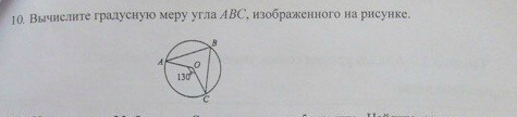угол АОС=130 , АОС - центральный угол, значит дуга АС=130 ,а угол АБС=130/2=65