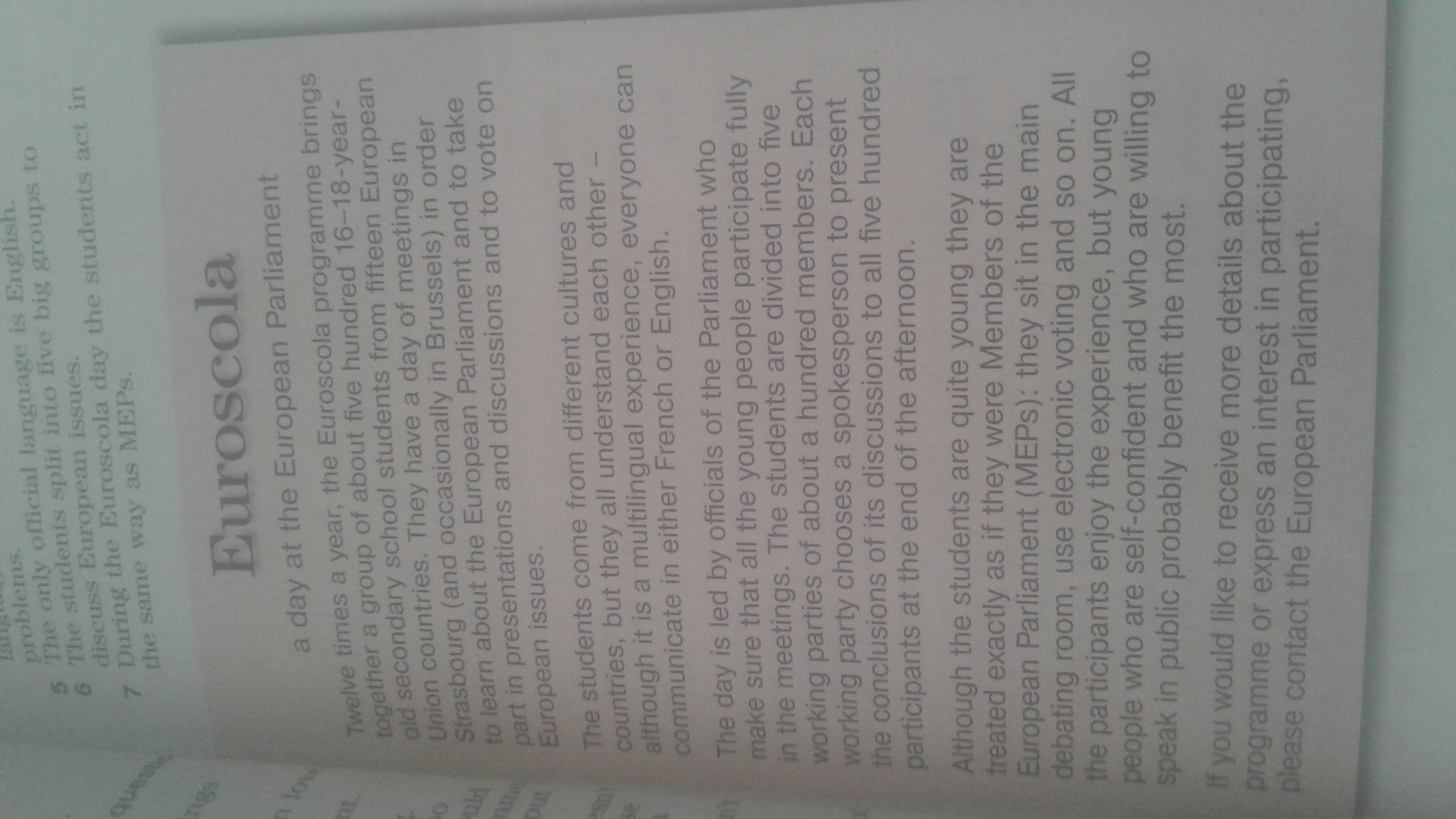 12 раз в год программа Эуроскола вместе собирают группу из 500 16-18-летних учеников средней школы из 15 стран Европейского союза. У них проходит встреча в Страссбурге (а точнее в Брюсселе), в порядке получения знаний о Европейском парламенте, а также принятия участия в презентациях и дискуссиях и голосование по европейским вопросам.