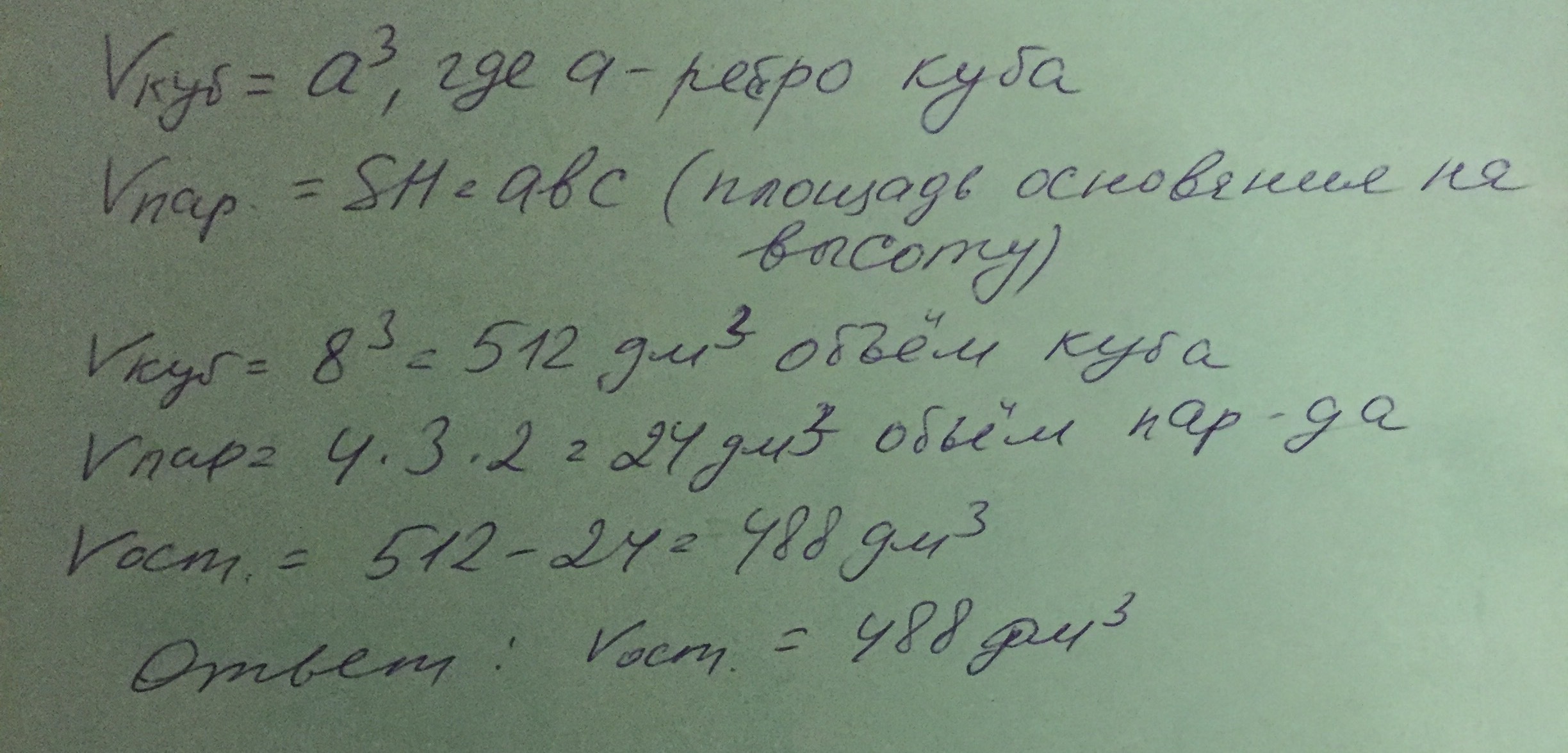 Из куба ребром 8дм вырезан брусок - прямоугольный параллелепипид с измерениями 4дм, 3дм и 2дм. Найдите объем оставшейся части. Укажите используемые формулы.