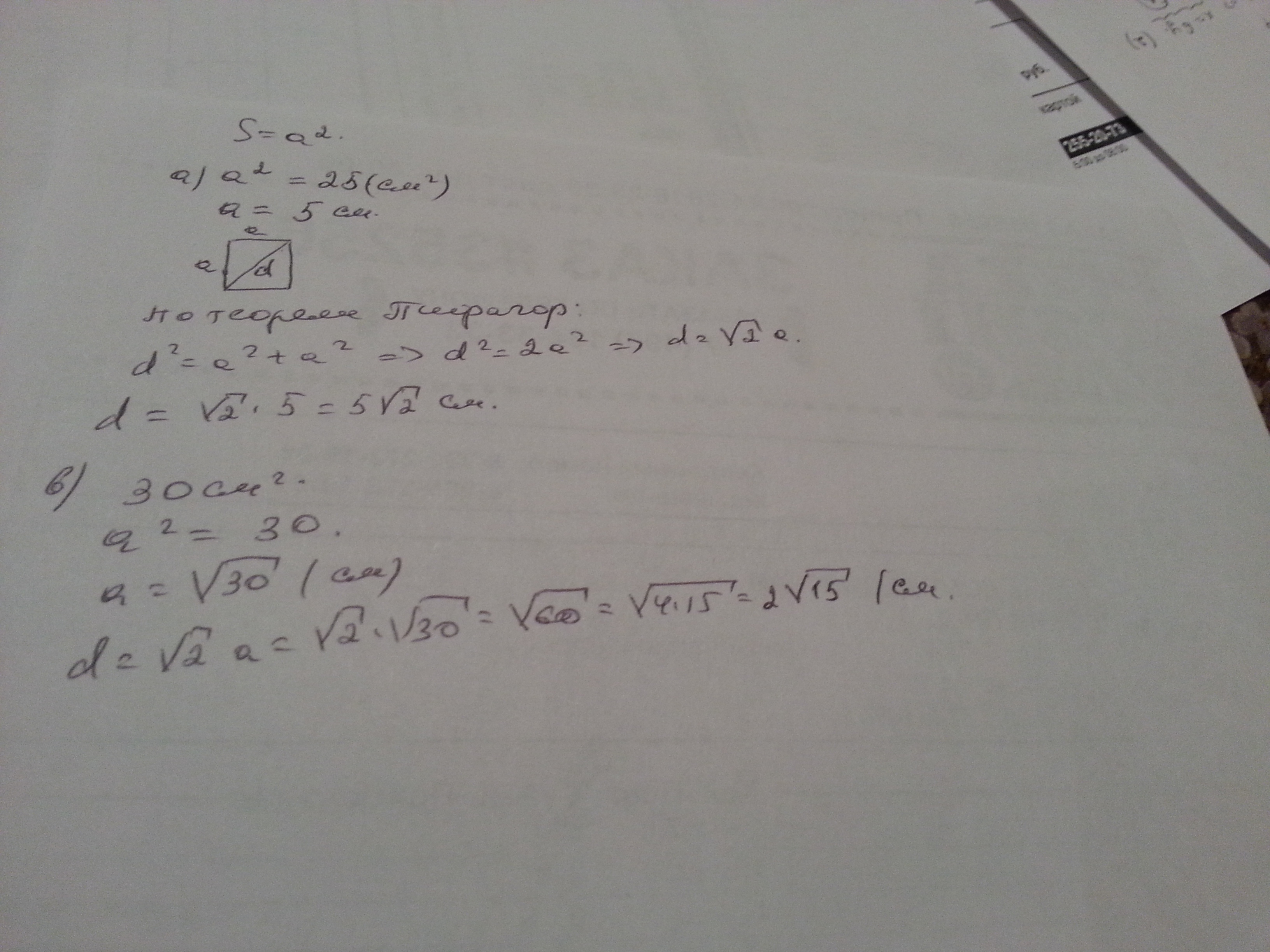 Но если вы такое не проходили, то: сторона равняется корень из 25, то есть 5. Треугольник равнобедренный и прямоугольный, по теореме Пифагора, гипотенуза прямоугольного прямоугольника равна корень из (а^2+b^2), то есть гипотенуза равна: корень из 5^2+5^2=корень из 50. С b тоже самое, только вместо 25 поставить 30
