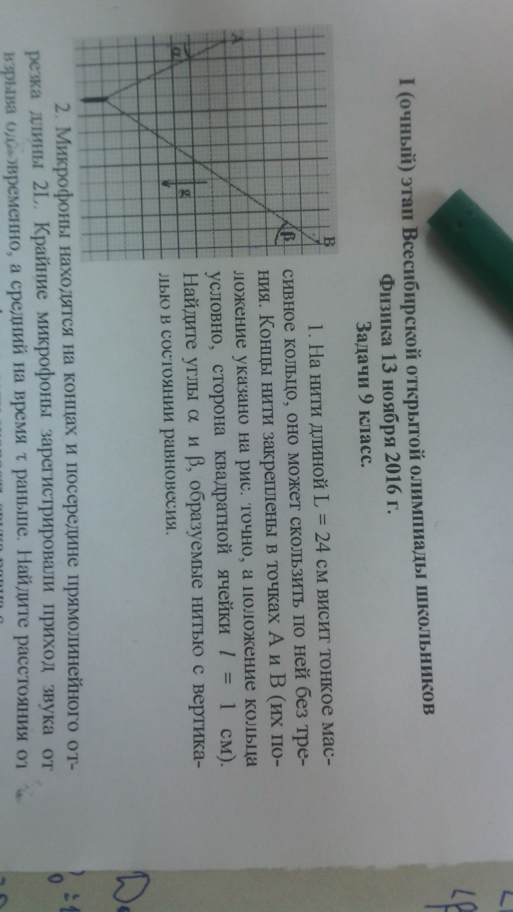 На нити длиной L=24 см висит тонкое массивное кольцо, оно может скользить по ней без трения. Концы закреплены в точках А и В. Найдите углы а и в