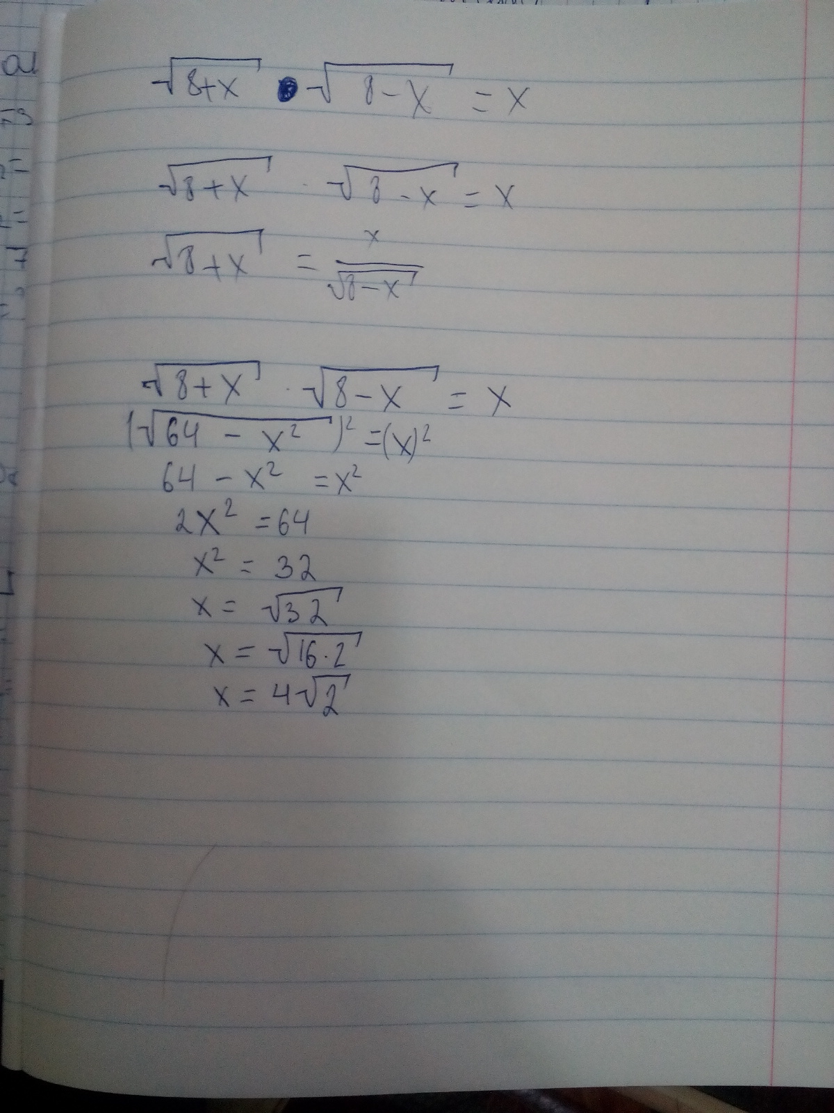 √(8+x) *√(8-x) = x, x не может быть отрицательным