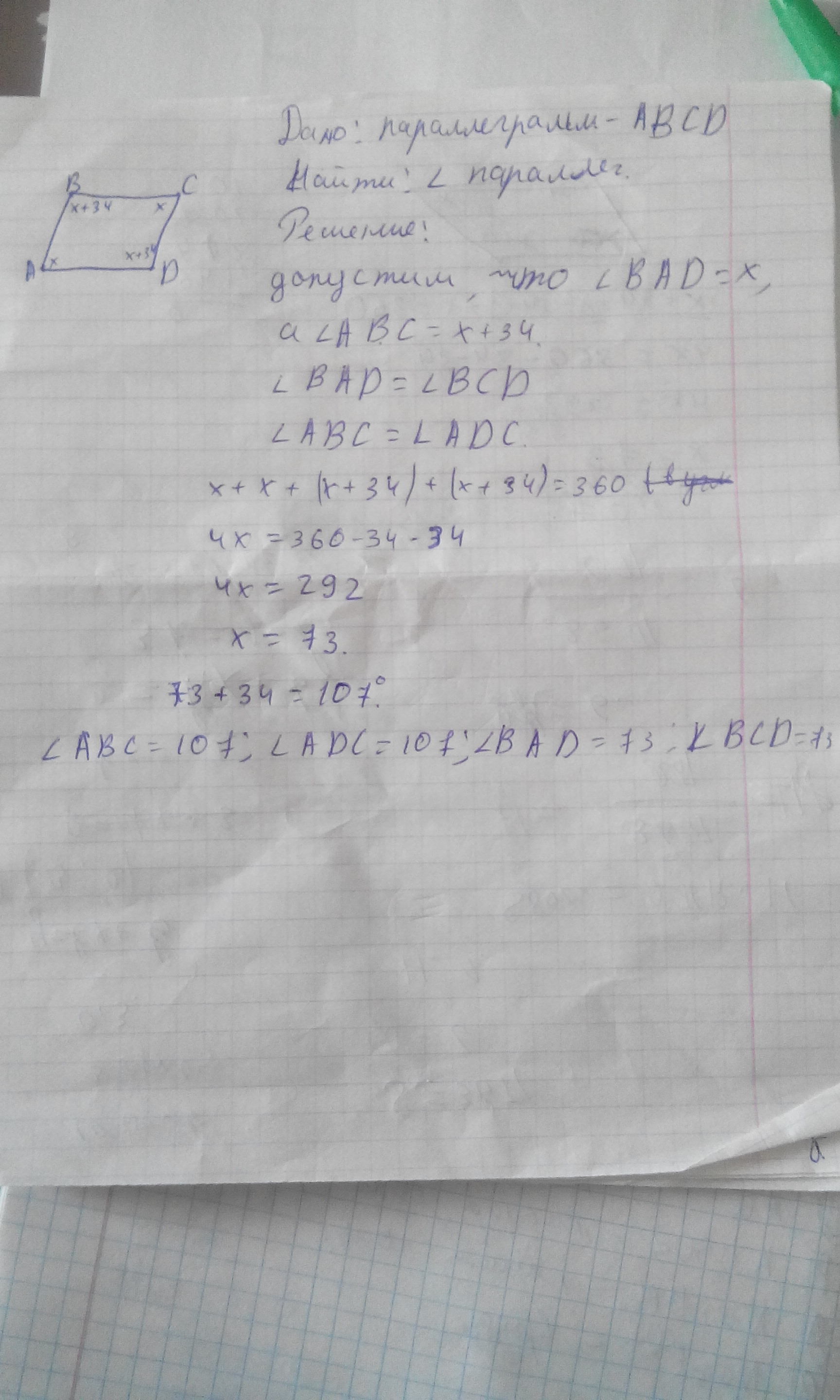 Один из углов параллелограмма на 34 градуса больше другого. Чему равны углы параллелограмма?