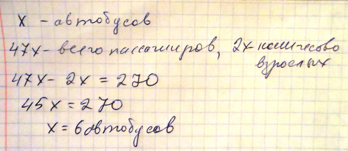 Люди решите задачу плииззз.:для отправки детей в лагерь было заказано несколько автобусов .В них поровну рассадили 270детей.Кроме детей в каждый автобус сели по двое взрослый. Сколько было автобусов ,если в каждом находилось 47 пассажиров!