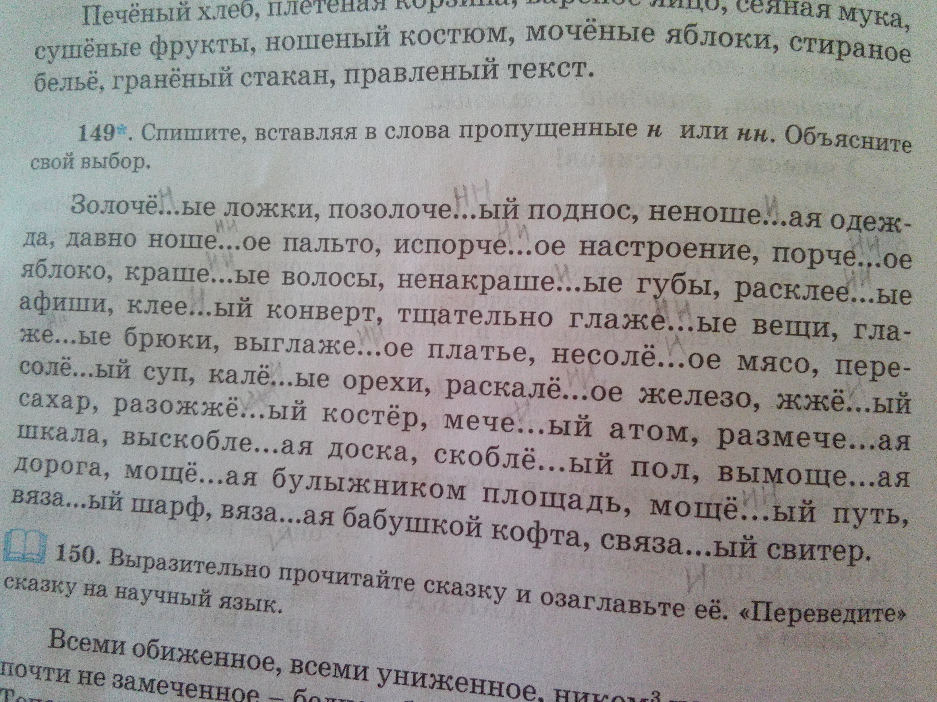 Золочёные ложки,позолоченный поднос,неношеная одежда,давно ношенное пальто,испорченное настроение,порченое яблоко,покрашенные волосы,некрашеные губы,расклеенные афиши,клееный конверт,тщательно глаженные вещи, глаженные брюки,выглаженное платье,несолёное мясо,пересоленный суп,калёные орехи,раскалённое железо,жженый сахар,разожженный костер,меченый атом,размеченная шкала,выскобленная доска, скобленый пол,вымощенная дорога,мощеная булыжником площадь,мощеный путь,