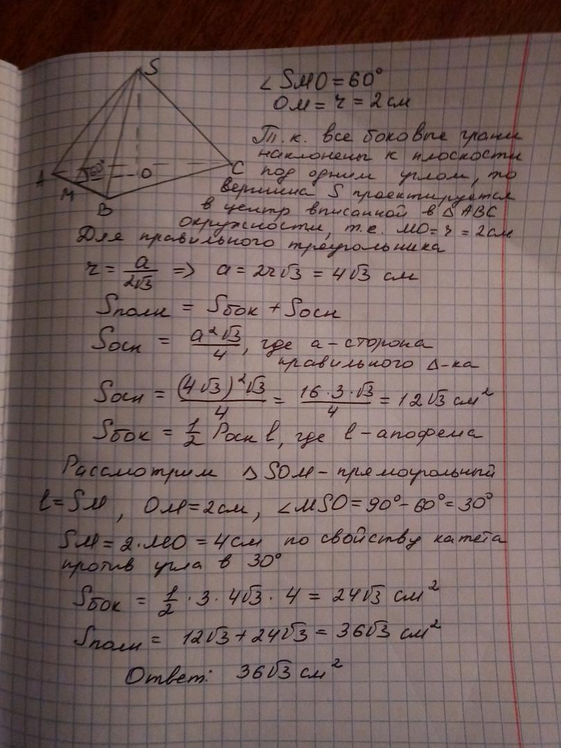 В правильной треугольной пирамиде радиус вписанной в основание окружности равен 2 см. Боковые грани наклонены к основанию под углом 60 градусов. Найдите площадь полной поверхности пирамиды
