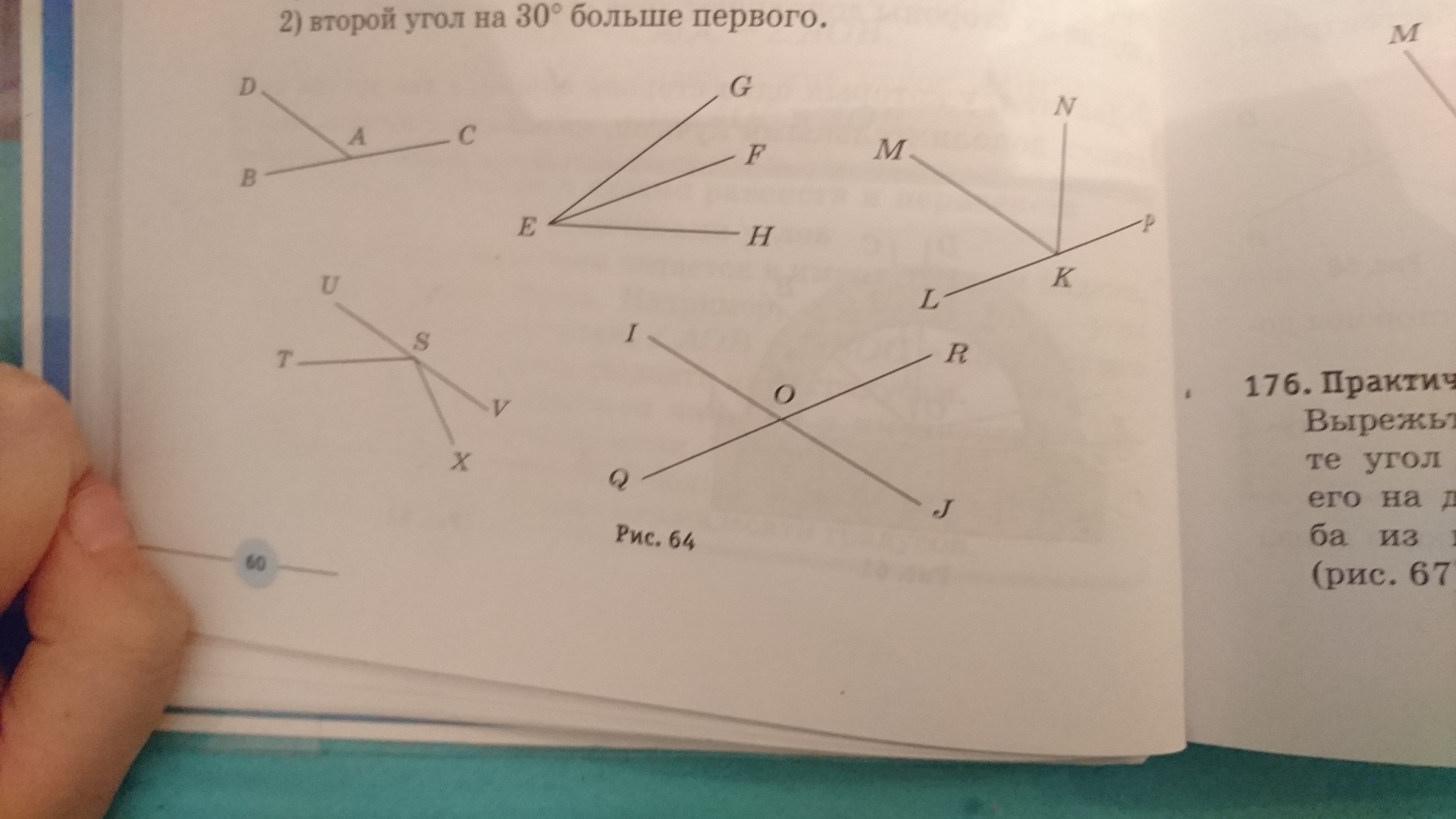 Два угла называются смежными, если у них 1 сторона общая, а другие стороны этих углов являются дополнительными полупрямыми. Чтобы ответить на 2 вопрос, нужно знать теорему 2.1 о том, что сумма смежных углов равна 180 градусов. Естественно самый первый рисунок- смежные углы. ДАВ и ДАС- смежные. Думаю на 2 рисунке нет смежных углов, ведь их сумма должна быть = 180, а тут явно не 180 градусов. Так рассуждая, можно сделать это задание. Рисунок 3 - ЛКМ и МКР- смежные. Также тут еще смежные- ЛКП и МКЛ, ЛКП и МКЛ. Думаю понятно объяснила)
