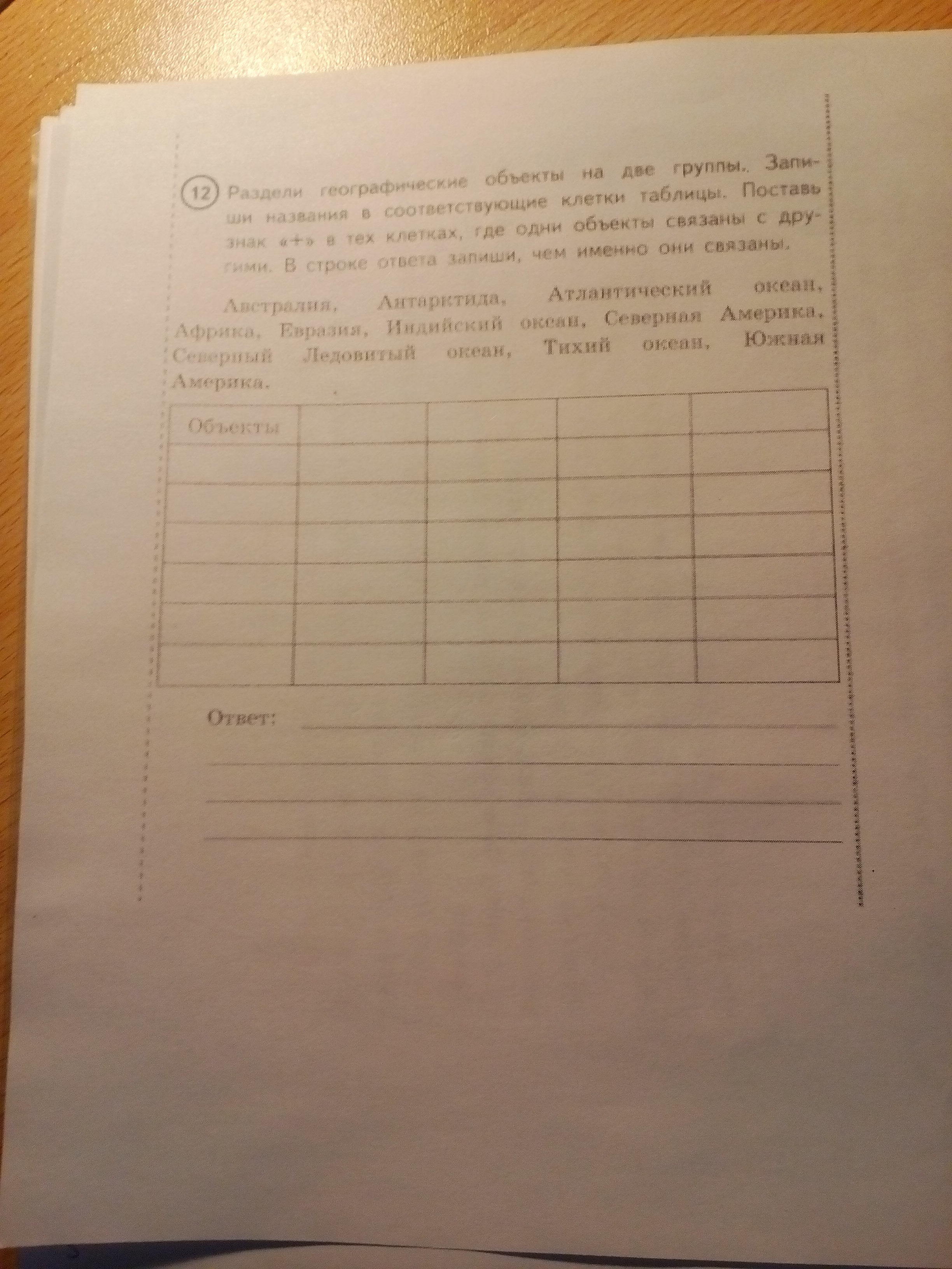 Раздели географические объекты на две группы. Запиши названия в соответствующие клетки таблицы. Поставь знак + в тех клетках, где одни объекты связаны с другими. В строке ответа запиши, чем именно они связаны.