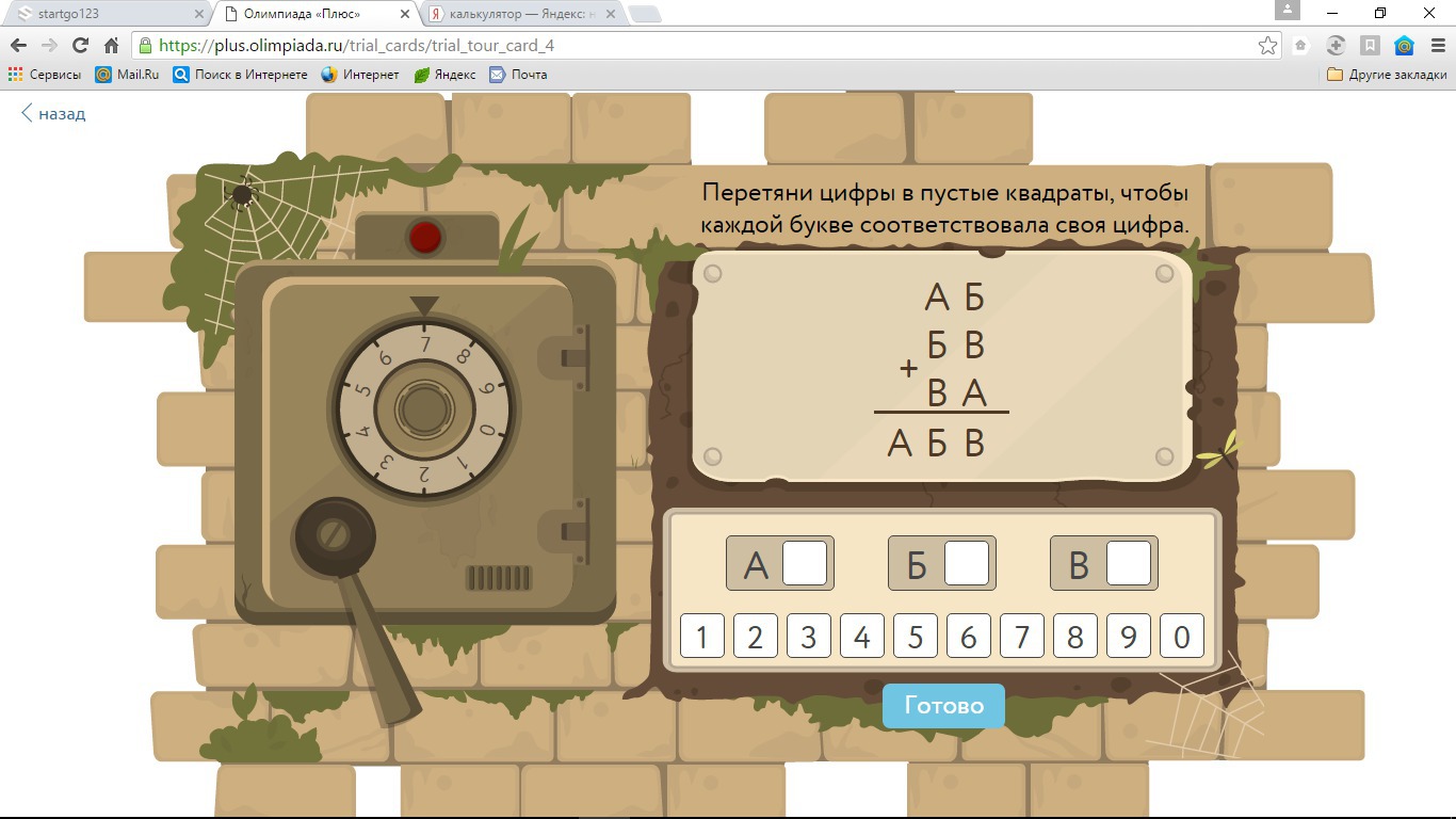 Поскольку при суммировании Б+В+А снова получается В, то, значит, А+Б дают в единицах НОЛЬ. Это могло бы быть, если бы было А=0 и Б=0, но т.к. каждой букве соотвествует своя цифра, то такого быть не может.