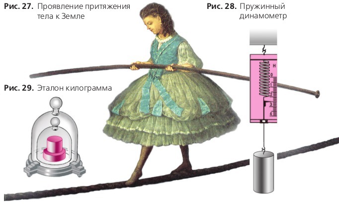 На груз, помещенный посередине металлической линейки или троса, и на груз, подвешенный при помощи нити на крючок пружинного динамометра, тоже действует сила притяжения Земли. В первом случае груз давит на опору и прогибает ее (рис. 27), во втором натягивает нить и растягивает пружину динамометра (рис. 28).
