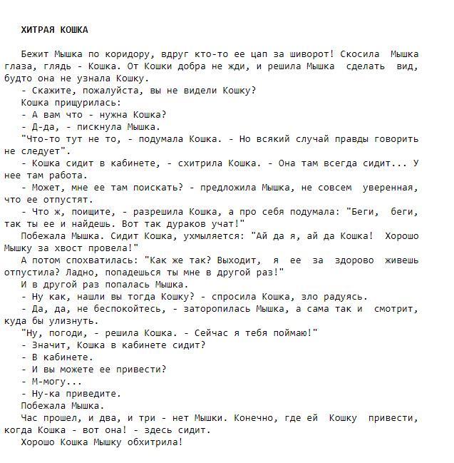 Но мир тесен, и вскоре произошла новая встреча старых знакомых. Разговор зашел о давешних поисках. Мышь отчаянно врала, что нашла Кошку в кабинете. Озадаченная хищница, решив уличить Мышку во лжи, снова пошла на хитрость. «Можешь мне привести Кошку из кабинета?» – мурлыкала она. Перепуганная Мышка, не веря своему счастью, сразу согласилась на новый поход по указанному адресу.