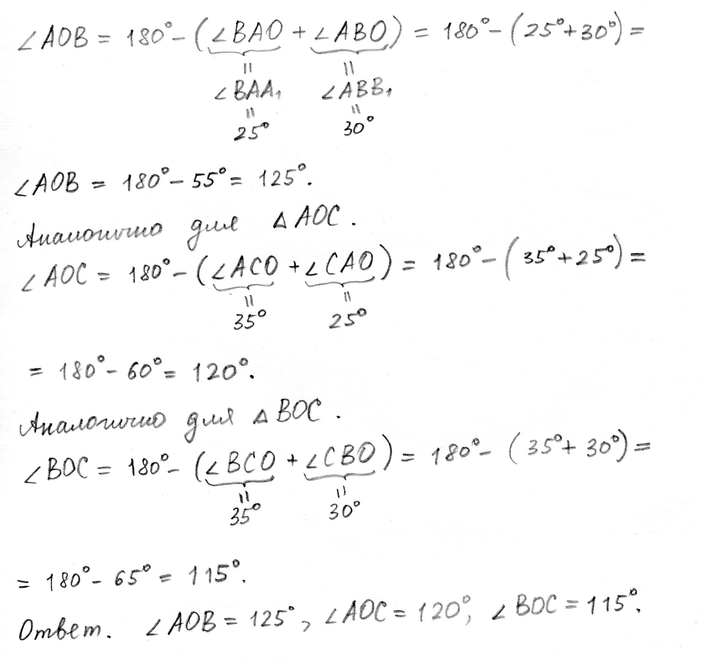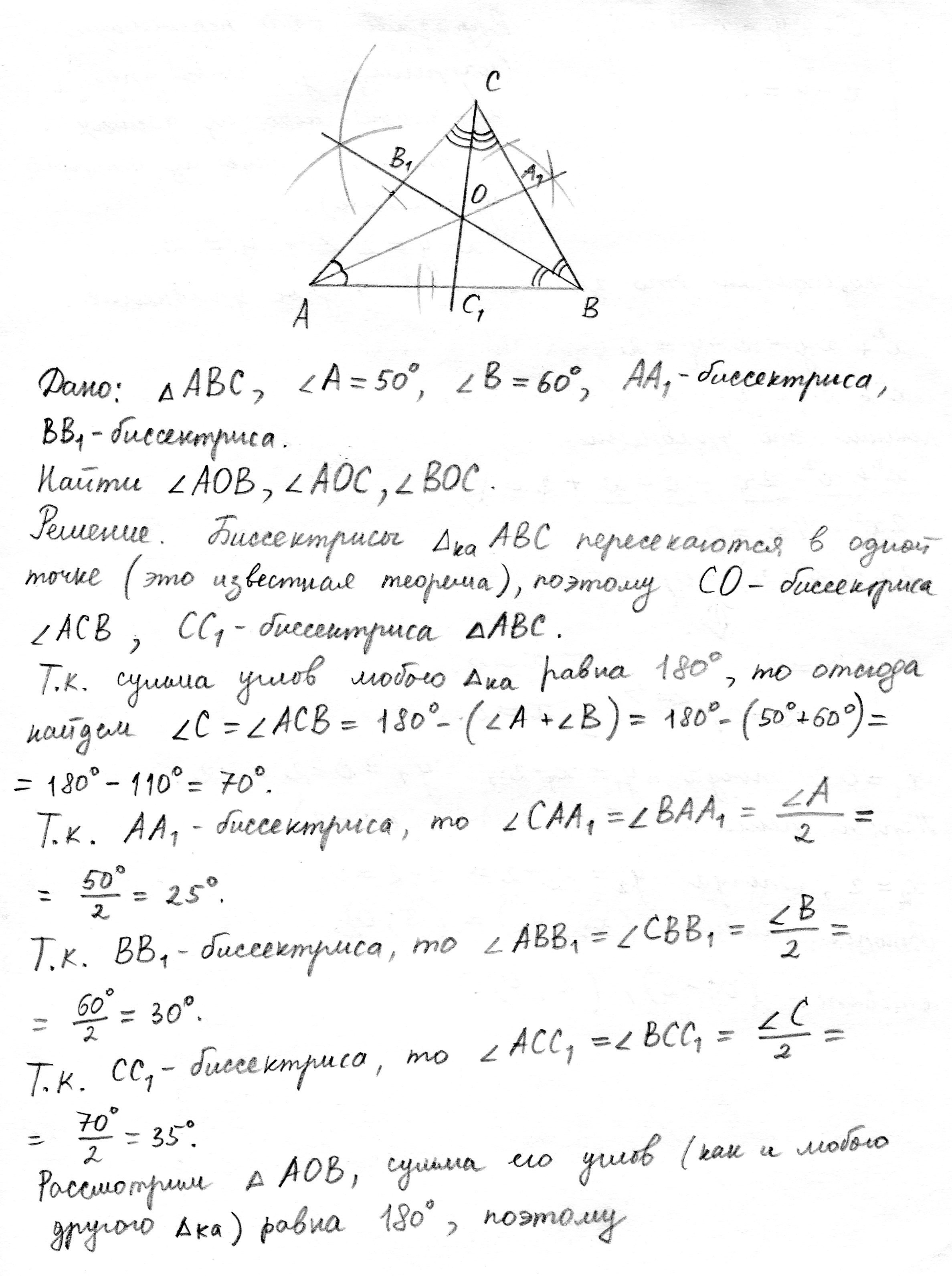 Биссектрисы АА₁ и ВВ₁ треугольника АВС пересекаются в пункте О.Найдите углы АОВ,АОС и ВОС,учитывая,что ∠А=50° и ∠В=60°