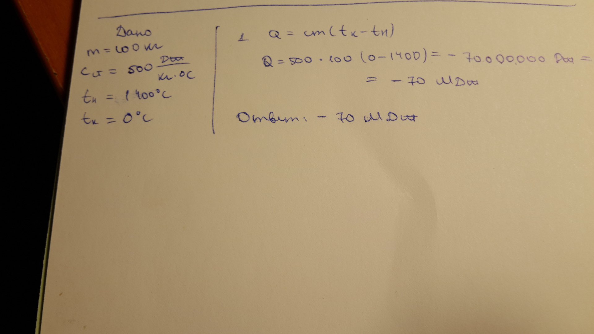 Какое количество теплоты выделится при кристаллизации и последующем охлаждении 100 кг стали, если начальная температура стали 1400°С конечная 0°С?
