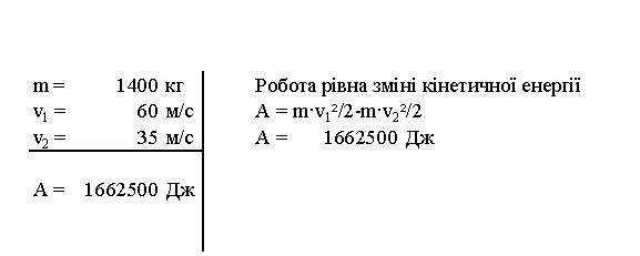 Автомобіль масою m починає гальмувати зі швидкістю V1 і через якийсь час його швидкість стала дорівнювати V2 . Чому дорівнює робота сили тертя на цій ділянці ?
