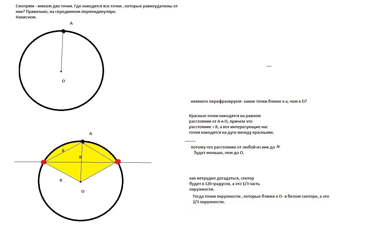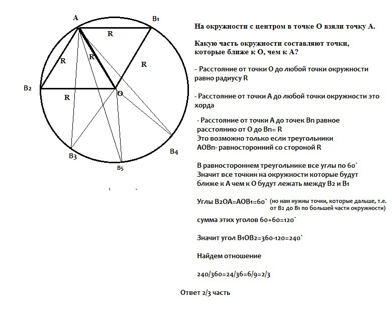 На окружности с центром в точке О взяли точку А. Какую часть окружности составляют точки, которые ближе к О, чем к А?
