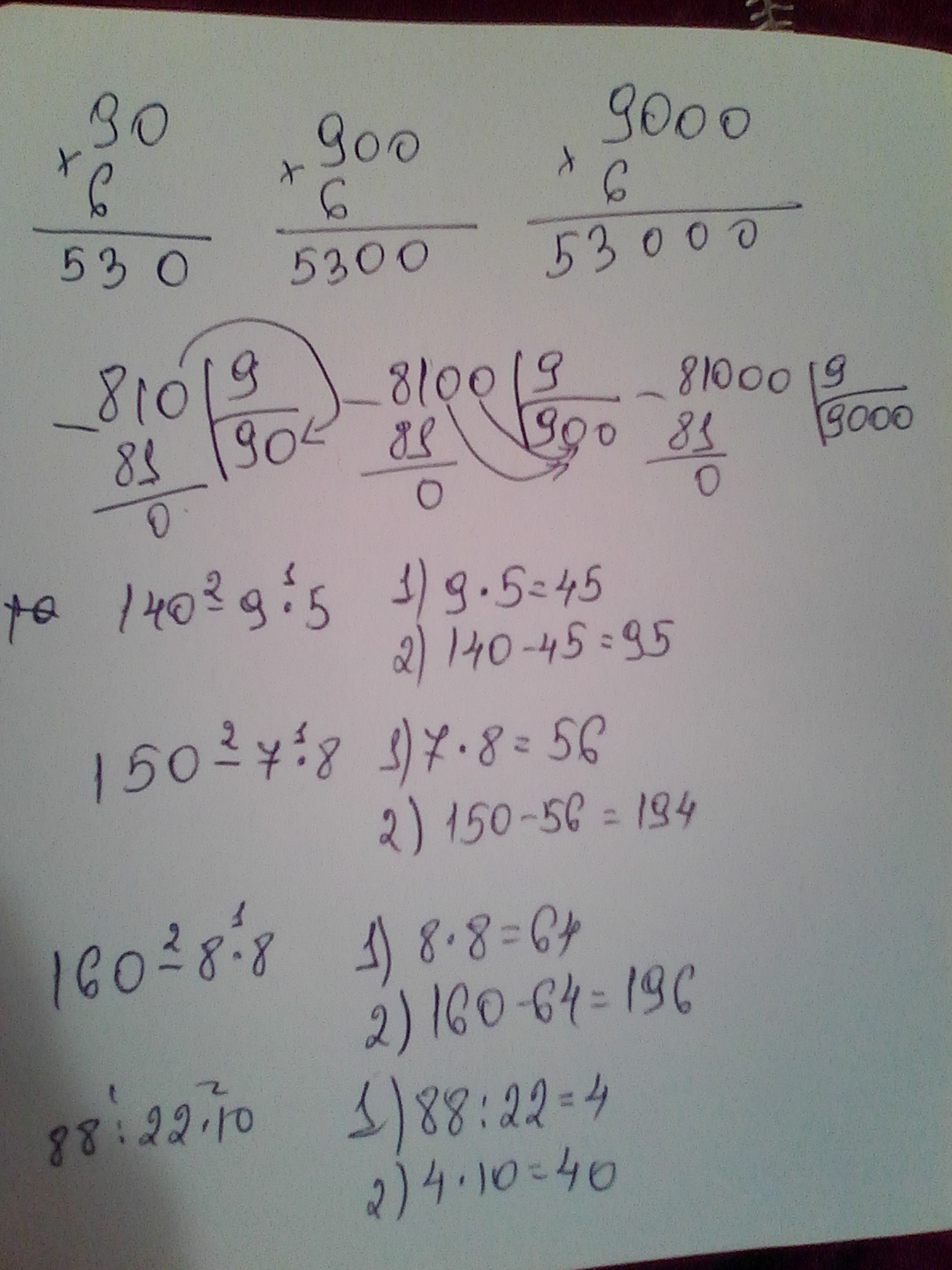 как решить в столбик 90×6. 900×6. 9000×6. 810÷9. 8100÷9. 81000÷9. 140-9×5. 150-7×8. 160-8×8. 88÷22×10. 77÷11×100. 96÷32×1000 помогите пожалуйста.