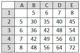 Нужно с помощью электронных таблиц построить таблицу значений формулы х+x*у для значений х и у от 5 до 8. Для этого сначала в диапазонах В1:Е1 и А2:А5 записали числа от 5 до 8. Затем в ячейку E3 записали формулу (А3 - значение х, E1 - значение y), после чего эта формула была скопирована во все ячейки диапазона В2:Е5. В итоге на экране получился фрагмент таблицы. Какая формула была записана в ячейку E3?