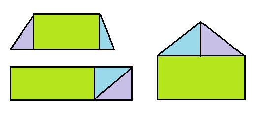 Сложить четырёхугольник и пятиугольник из прямоугольника и треугольников можно только в том случае, если какие-то пары сторон у фигур будут равны. Одно из решений в приложении.
