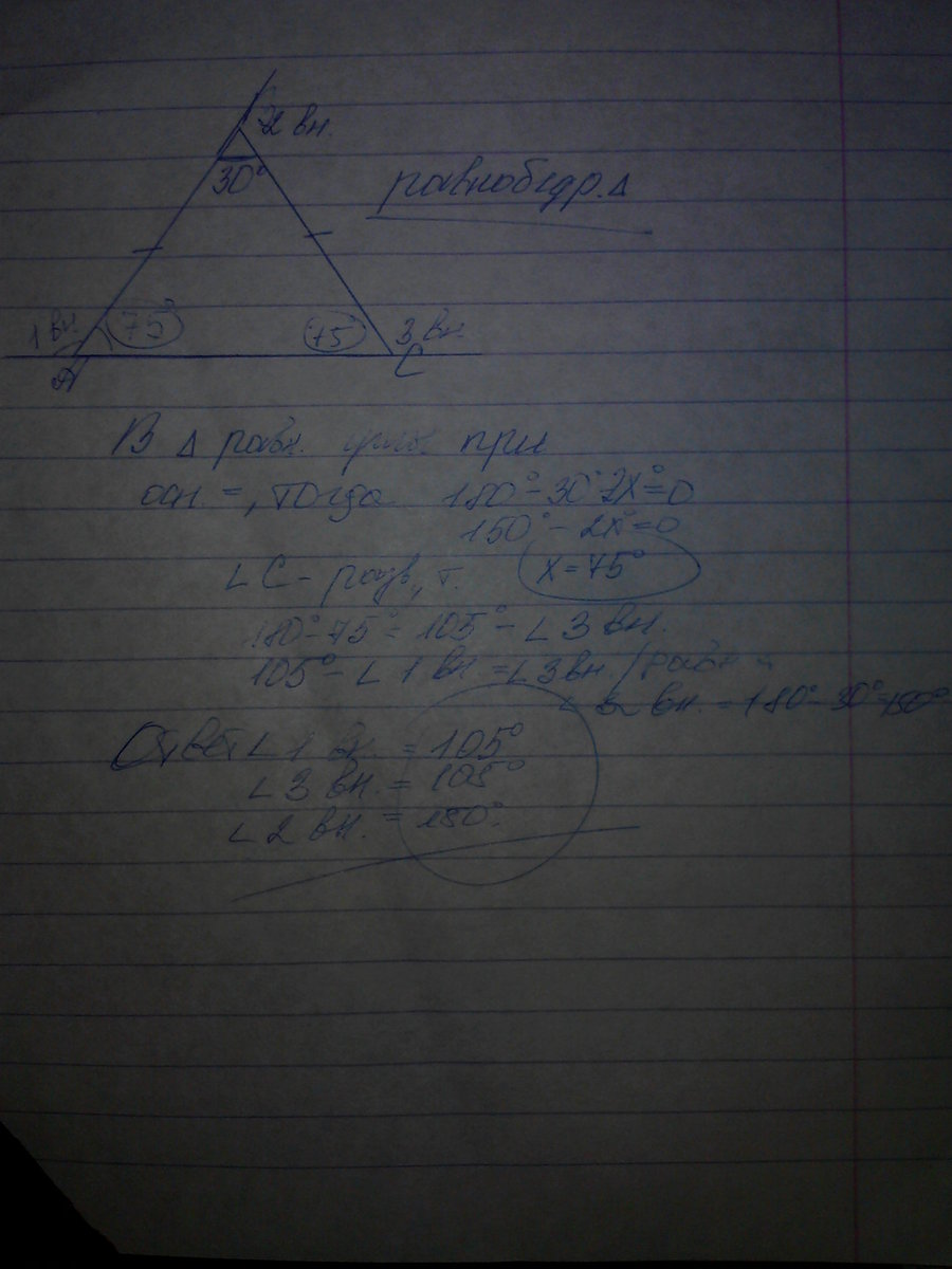 ABC-равнобедренный треугольник.AB=BC,угол B=30 гр.Найдите градусные меры внешних углов треугольника.